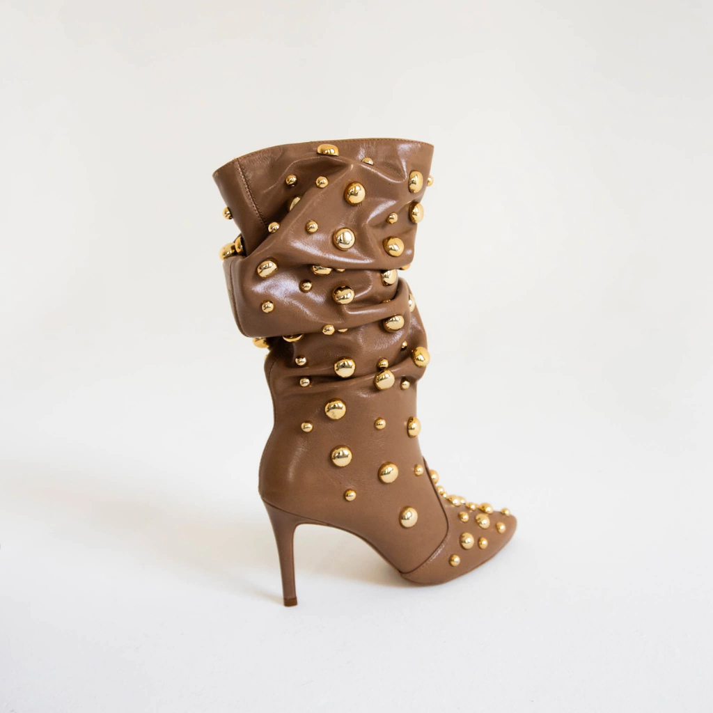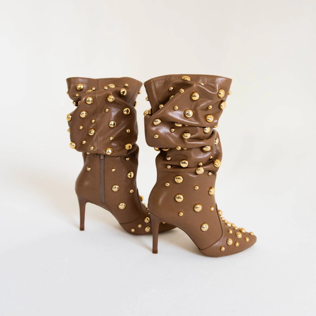 Confeccionada em couro legítimo, seu cano alto com efeito franzido é coberto por esferas metálicas douradas aplicadas uma a uma, criando um visual escultural e ousado — sem abrir mão da elegância.