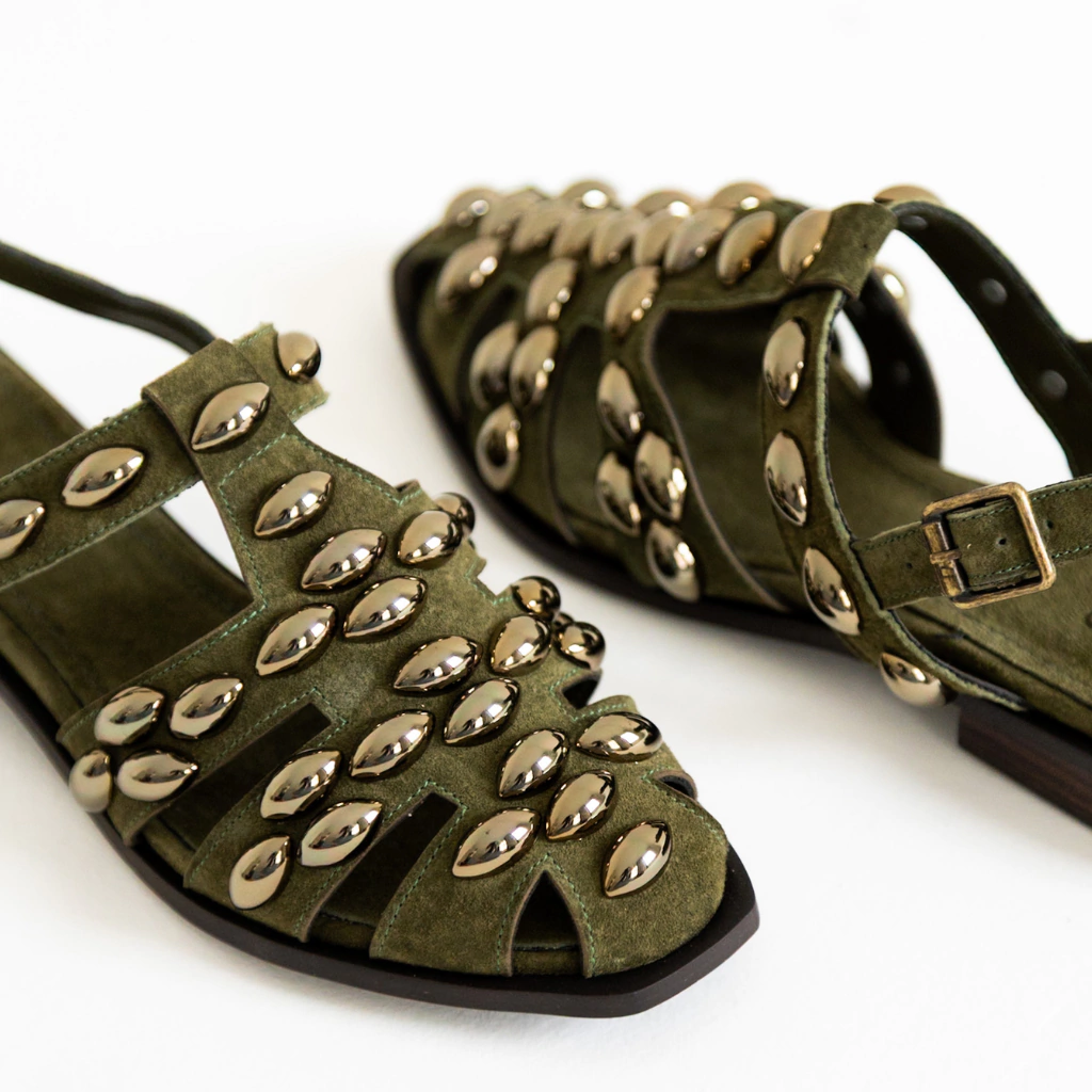 A Fisherman Lara traz a autenticidade da camurça em couro em um design marcante, que une a rusticidade sofisticada da fisherman sandal ao brilho imponente dos metais. Na tonalidade Oliva, o modelo ganha destaque pelas aplicações de maxi esferas em ouro velho, que adicionam personalidade e um toque de ousadia moderna, sem perder a elegância atemporal.