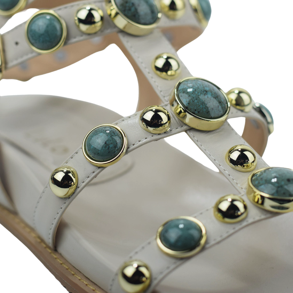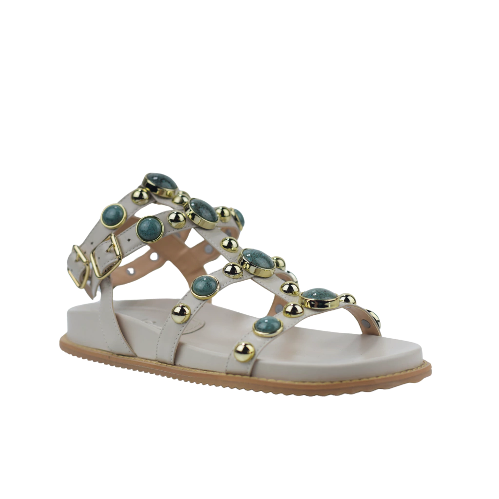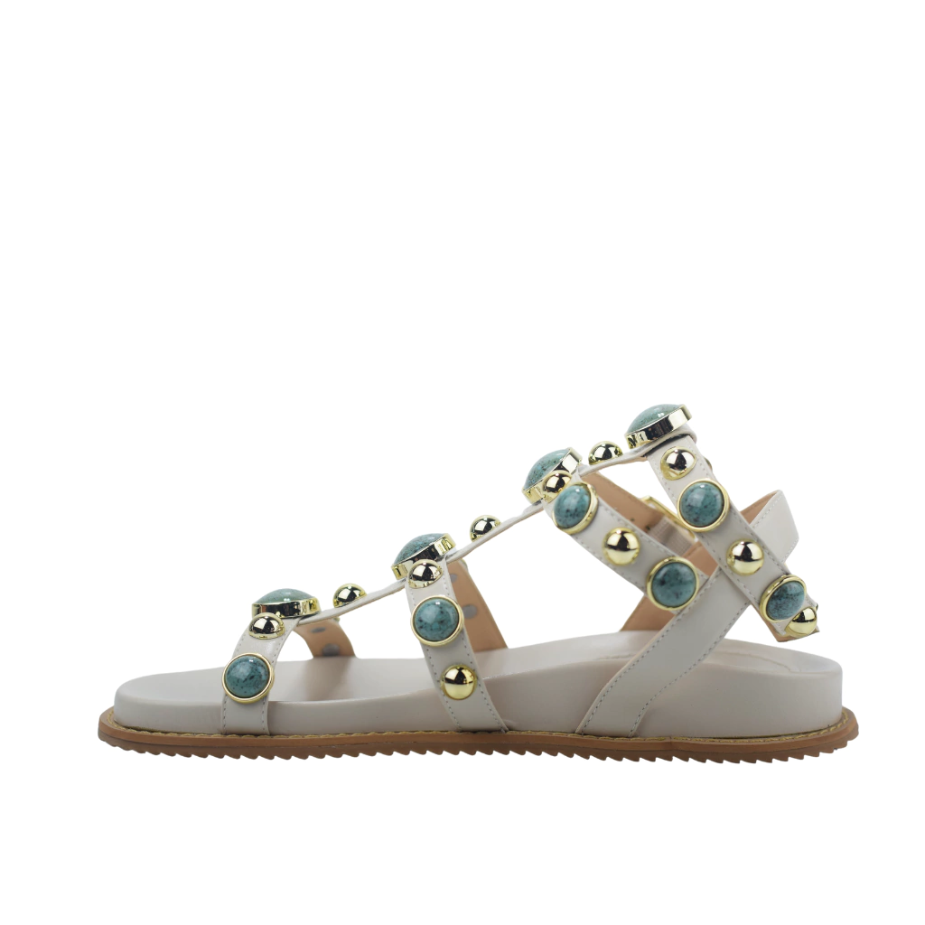 Com um design exclusivo e sofisticado, a Flat Creta se destaca pelas pedras em tom turquesa e tachas douradas, que adicionam um toque de luxo e modernidade ao calçado. As tiras ajustáveis garantem um encaixe perfeito nos pés, proporcionando segurança e estabilidade a cada passo.