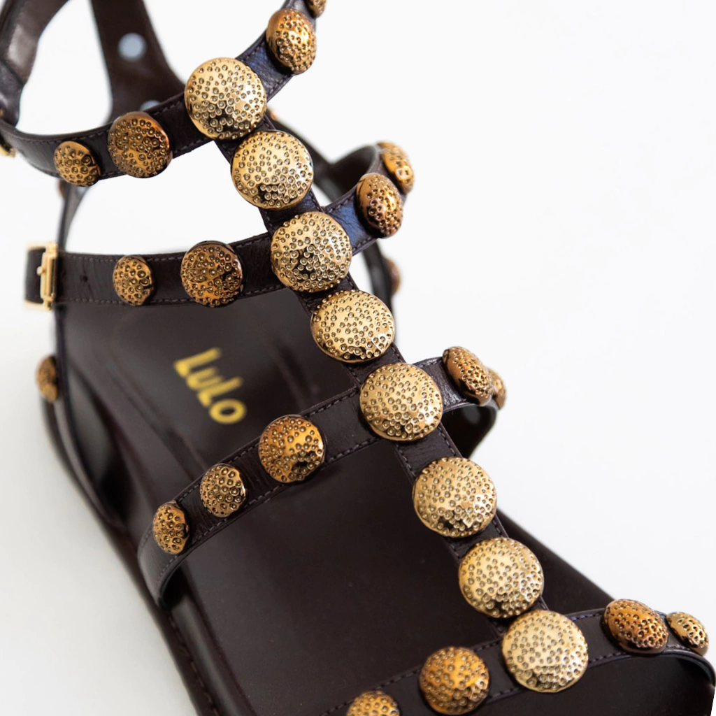 A Flat Duna traduz o equilíbrio perfeito entre sofisticação e conforto, em um design marcante que valoriza cada detalhe. Confeccionada em couro legítimo na elegante cor Cacau, o modelo se destaca pela aplicação de esferas metálicas texturizadas em dourado, que percorrem toda a extensão das tiras, criando um visual imponente e cheio de personalidade.