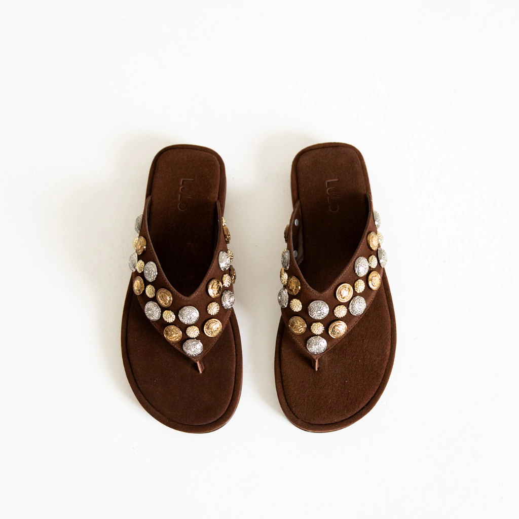 A Flat Maldivas é a definição de estilo descomplicado com toque sofisticado. Confeccionada em camurça de couro legítimo na cor Cacau, o modelo ganha destaque pelas aplicações de botões metálicos dourados e prateados em relevo, que adicionam brilho e personalidade ao design.
