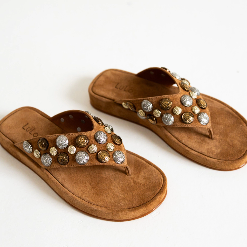 A Flat Maldivas é a definição de estilo descomplicado com toque sofisticado. Confeccionada em camurça de couro legítimo na cor Caramelo, o modelo ganha destaque pelas aplicações de botões metálicos dourados e prateados em relevo, que adicionam brilho e personalidade ao design.