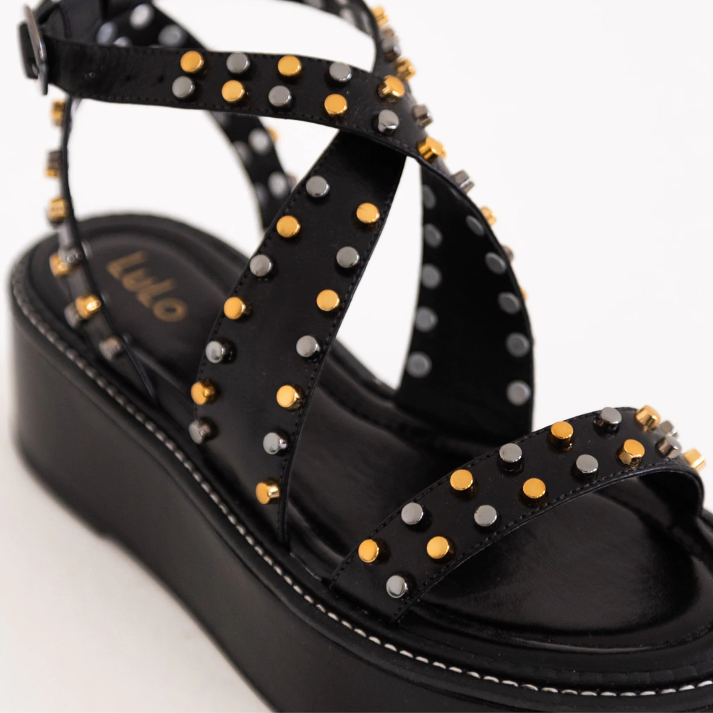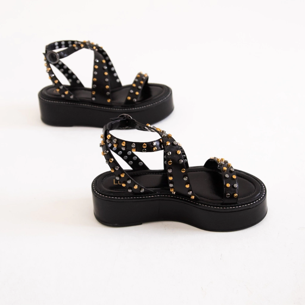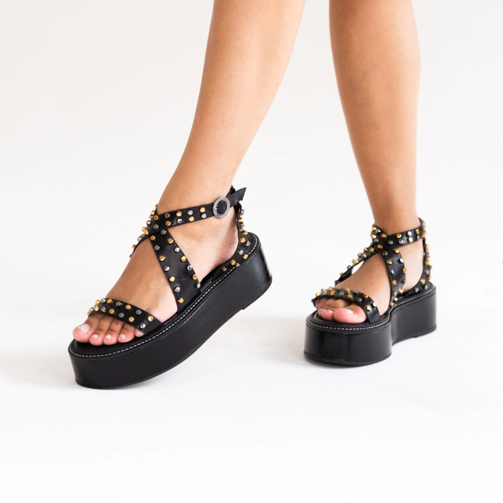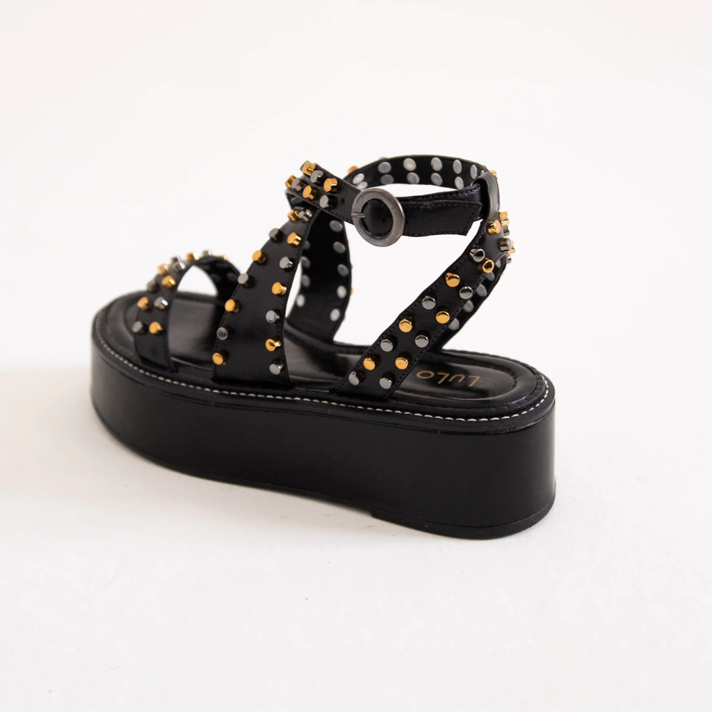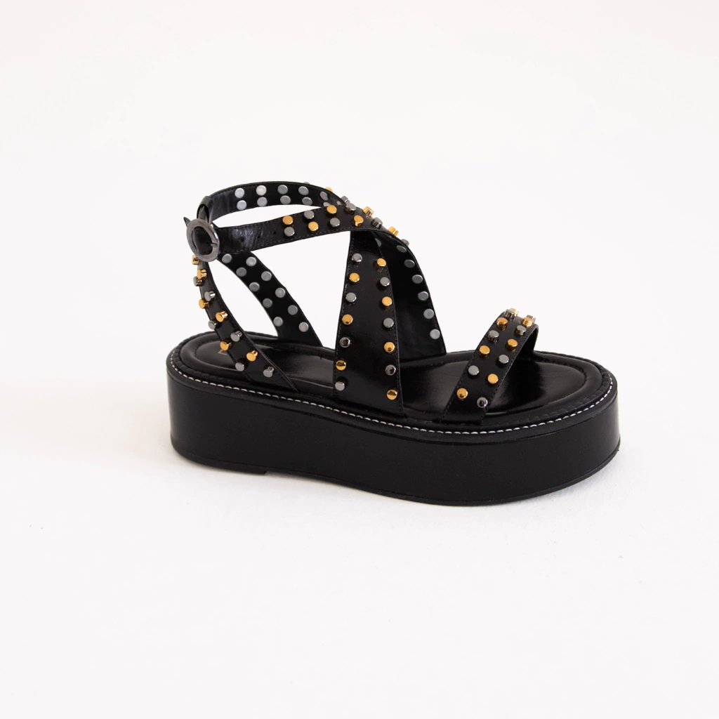 O Flat Mykonos combina conforto e personalidade em um design sofisticado e moderno. Confeccionado em couro legítimo, seu cabedal com tiras cruzadas e aplicações de mini studs metálicos em tons dourado e prata garantem um toque de atitude ao modelo. Sua estrutura proporciona praticidade e estilo, sendo ideal tanto para o dia a dia quanto para composições mais ousadas.