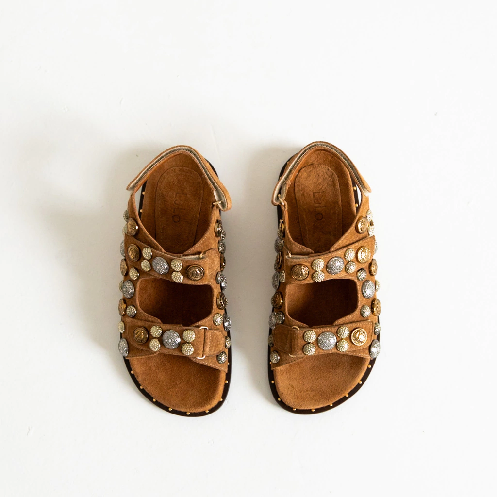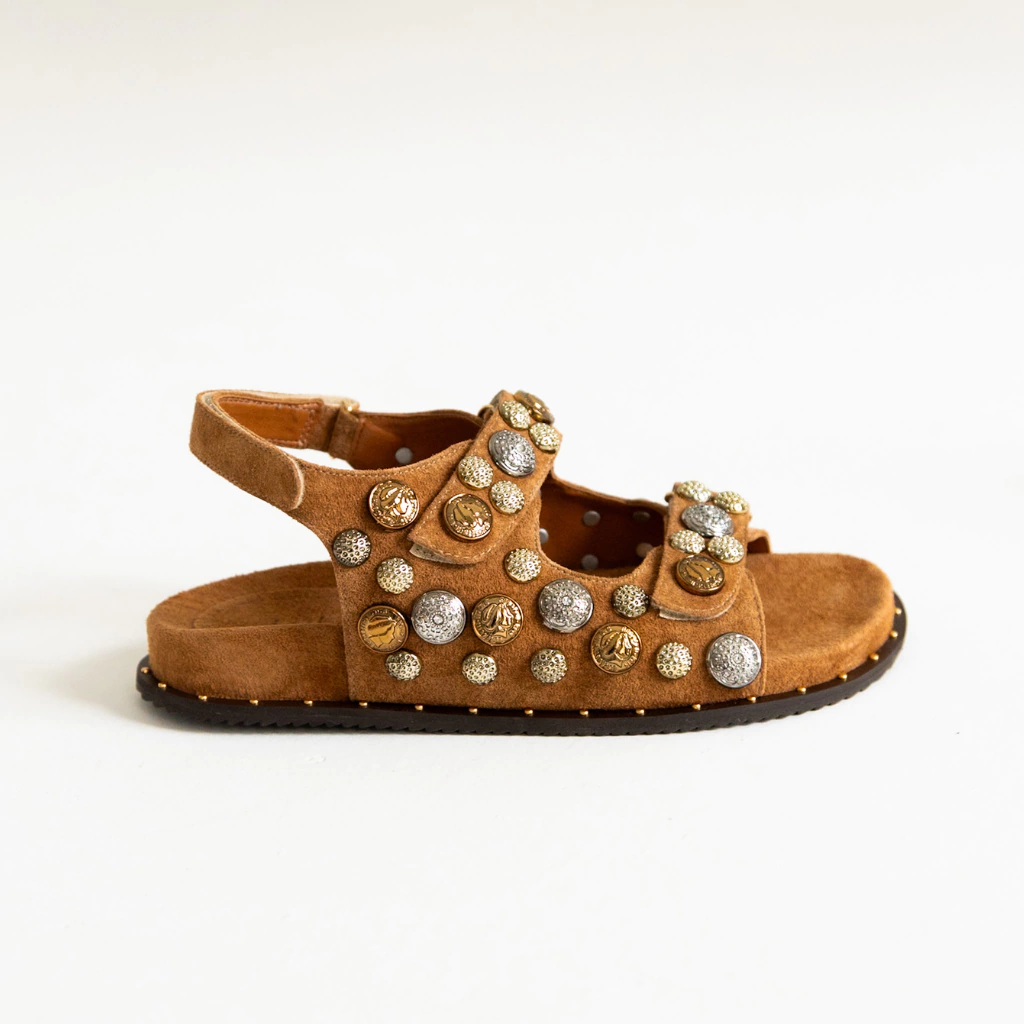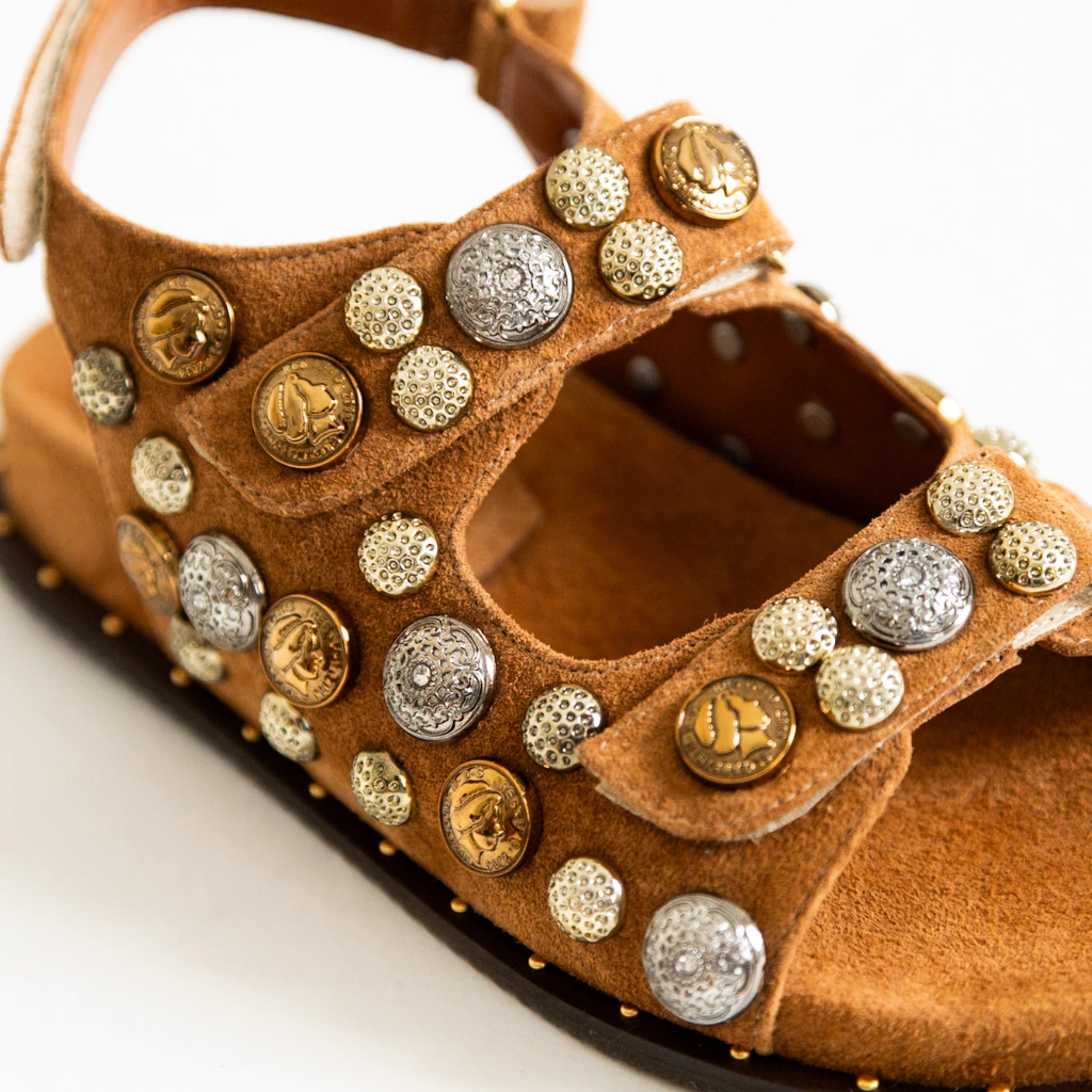 A Flat Verona é a união entre conforto e estilo em um design cheio de personalidade. Confeccionada em couro legítimo com acabamento em camurça na elegante cor Caramelo, ela se destaca pelas aplicações de tachas metálicas em diferentes tons, que adicionam brilho, atitude e um toque sofisticado ao modelo.