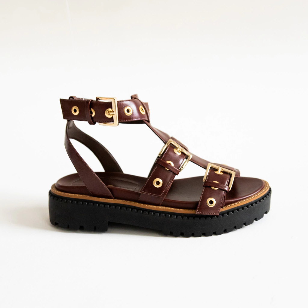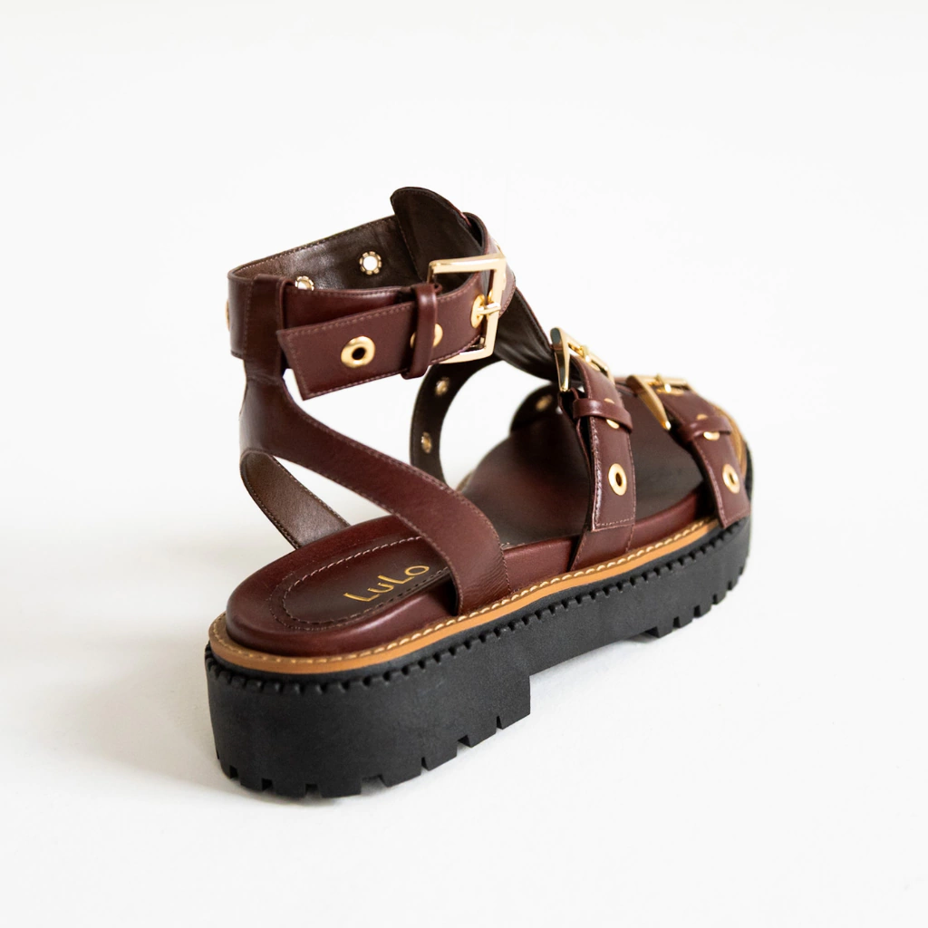 A Flatform Galway combina atitude e conforto em um design robusto que traduz modernidade. Confeccionada em couro legítimo na cor castanho, o modelo se destaca pelas fivelas e ilhoses dourados, que adicionam um toque de sofisticação e estilo marcante.