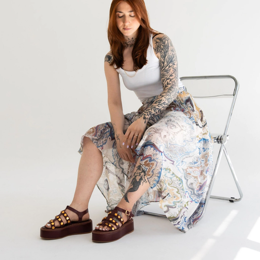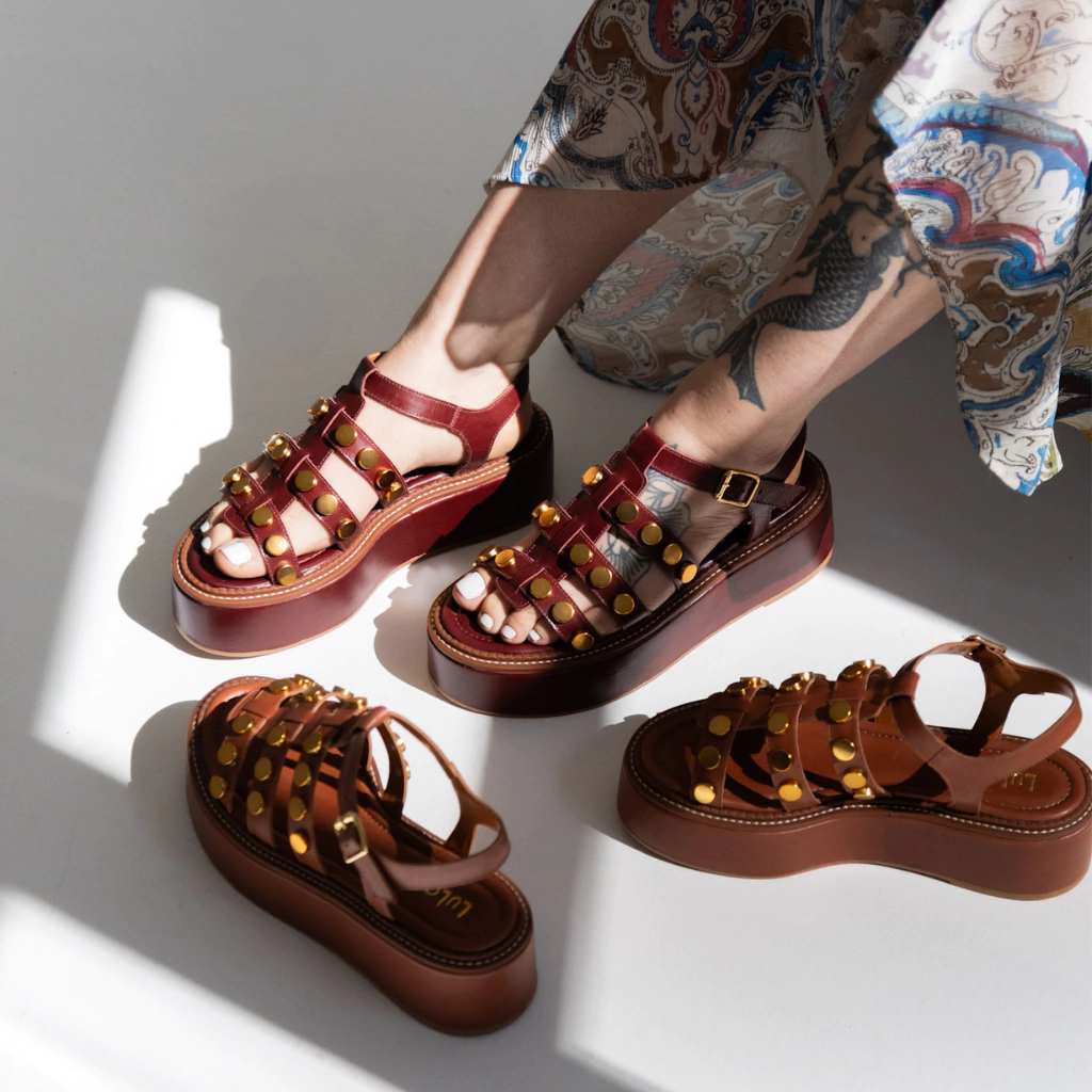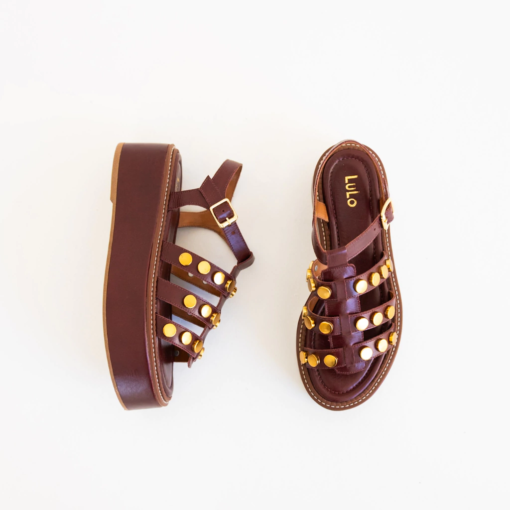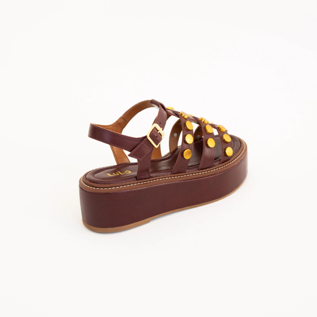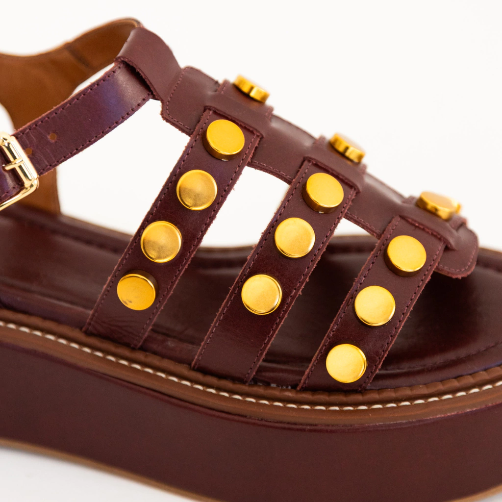 A Flatform Malta é a união perfeita entre estilo e conforto em um design que não passa despercebido. Confeccionada em couro legítimo na sofisticada cor Marsala, ela se destaca pelos detalhes em tachas douradas, que adicionam um toque moderno e cheio de atitude ao modelo.