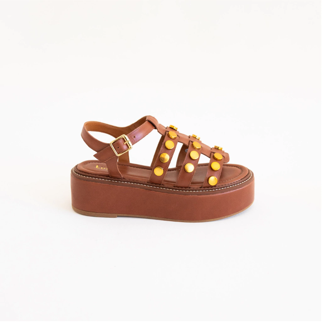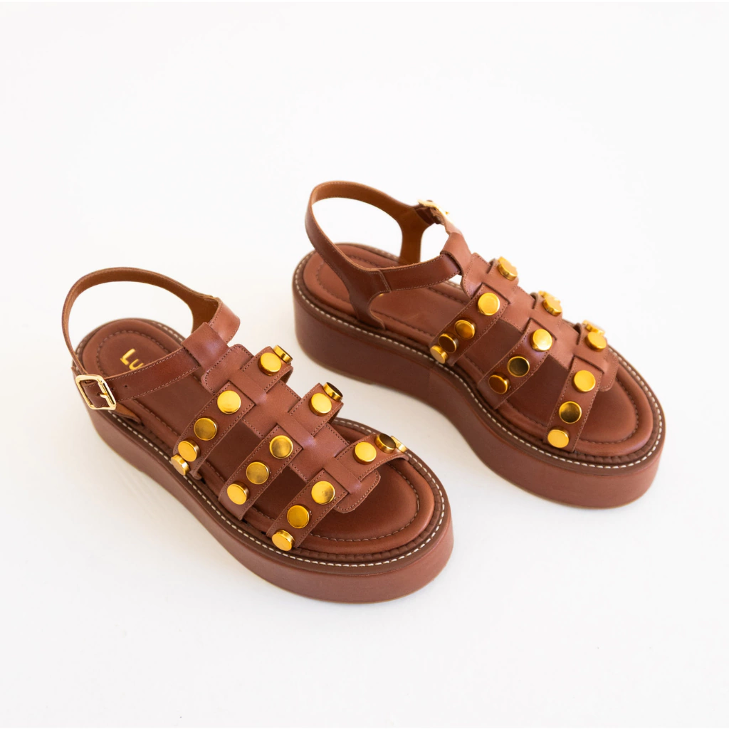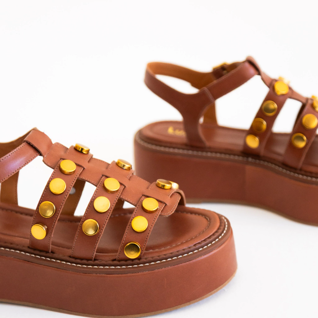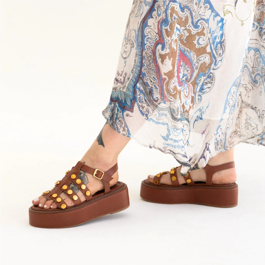 A Flatform Malta é a união perfeita entre estilo e conforto em um design que não passa despercebido. Confeccionada em couro legítimo na sofisticada cor Marrom Pinhão, ela se destaca pelos detalhes em tachas douradas, que adicionam um toque moderno e cheio de atitude ao modelo.