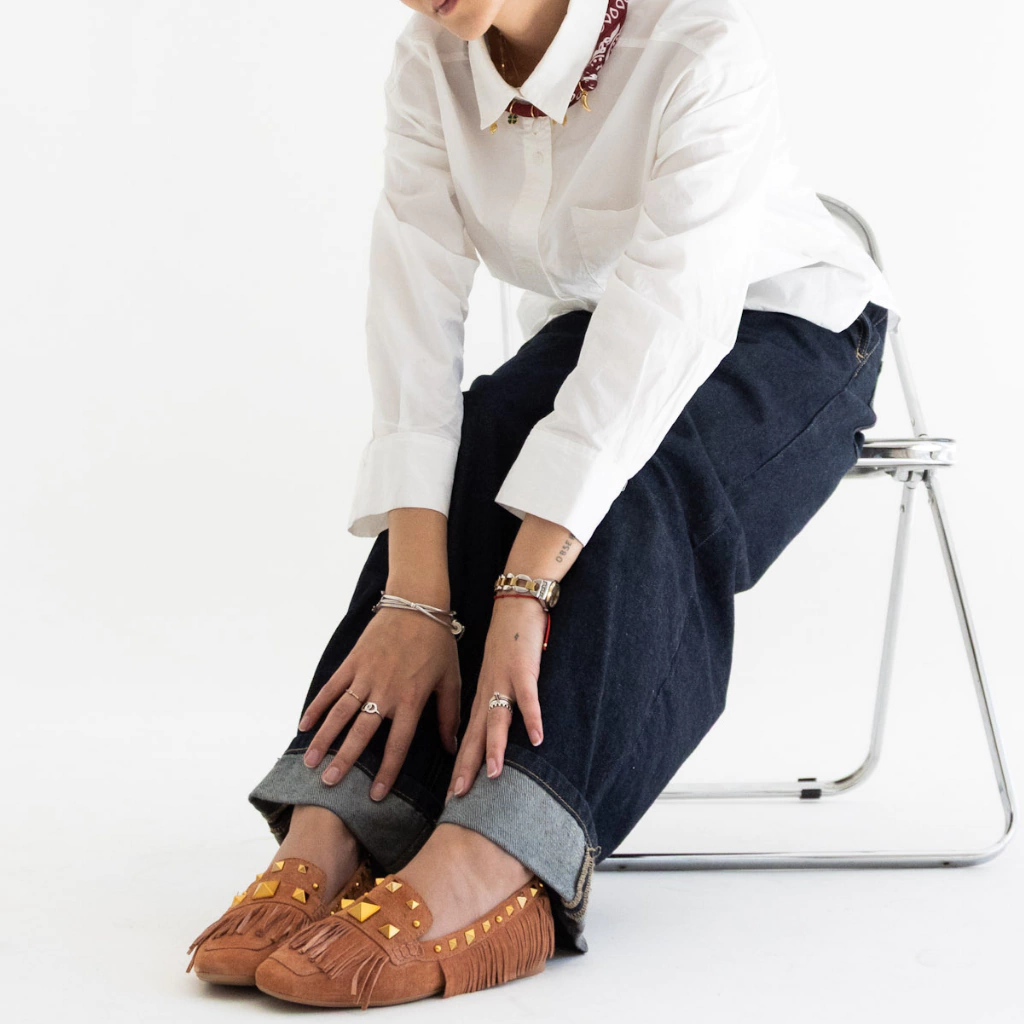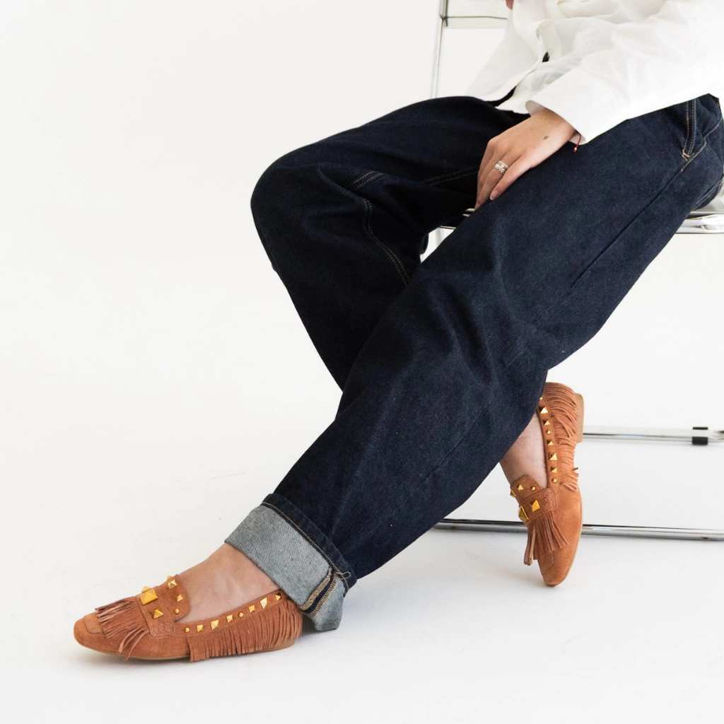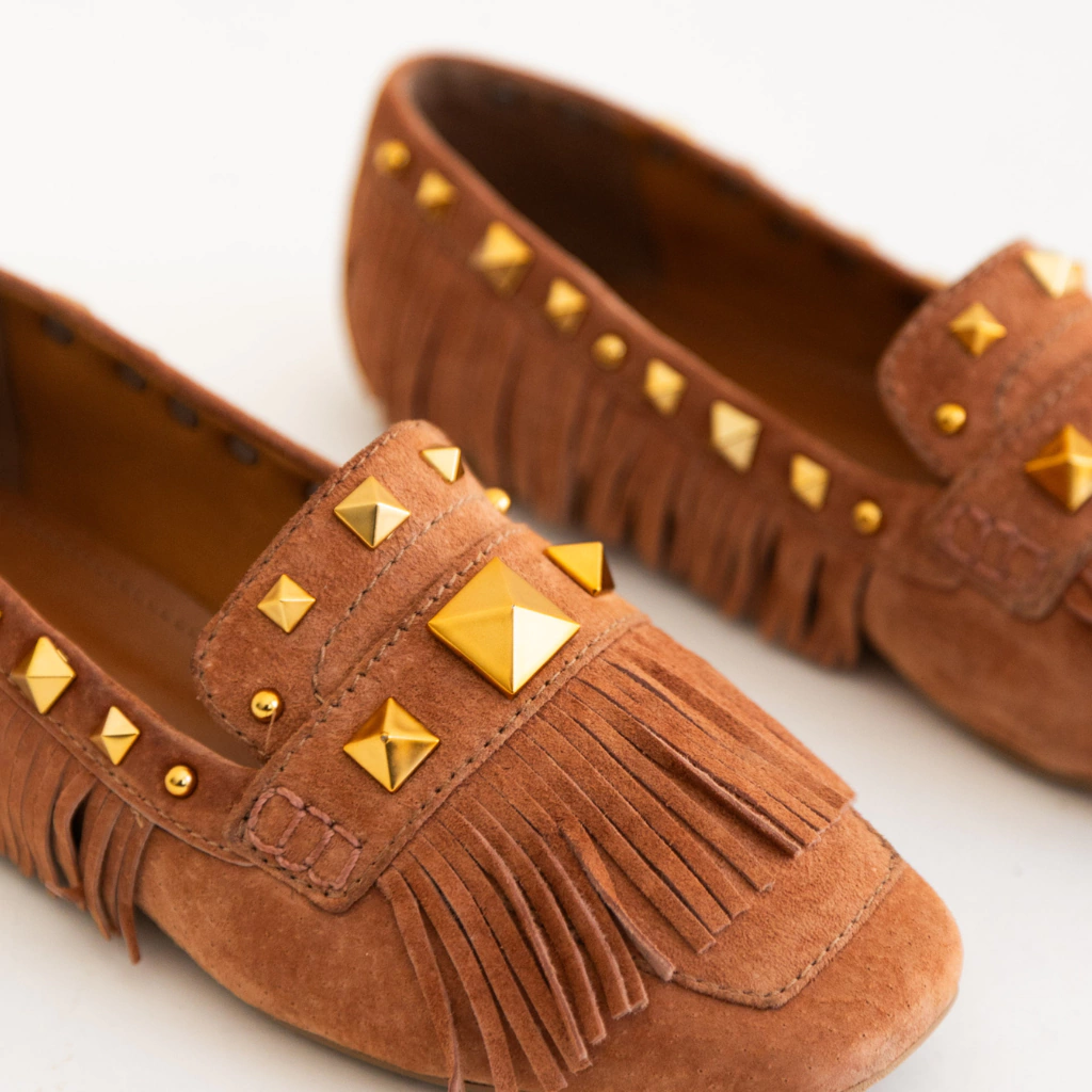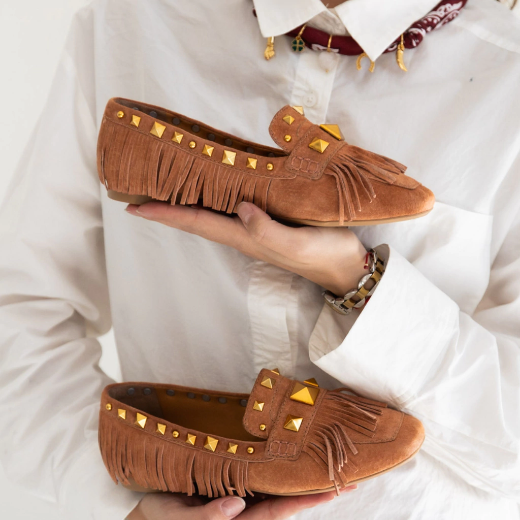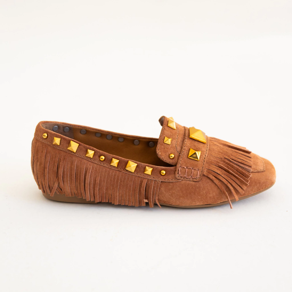 O Loafer Juno traz a elegância do suede couro em um design que combina sofisticação com personalidade. Na tonalidade Conhaque, ele se destaca pelas franjas e aplicações de tachas douradas, que adicionam um toque boho-chic moderno e marcante ao modelo.