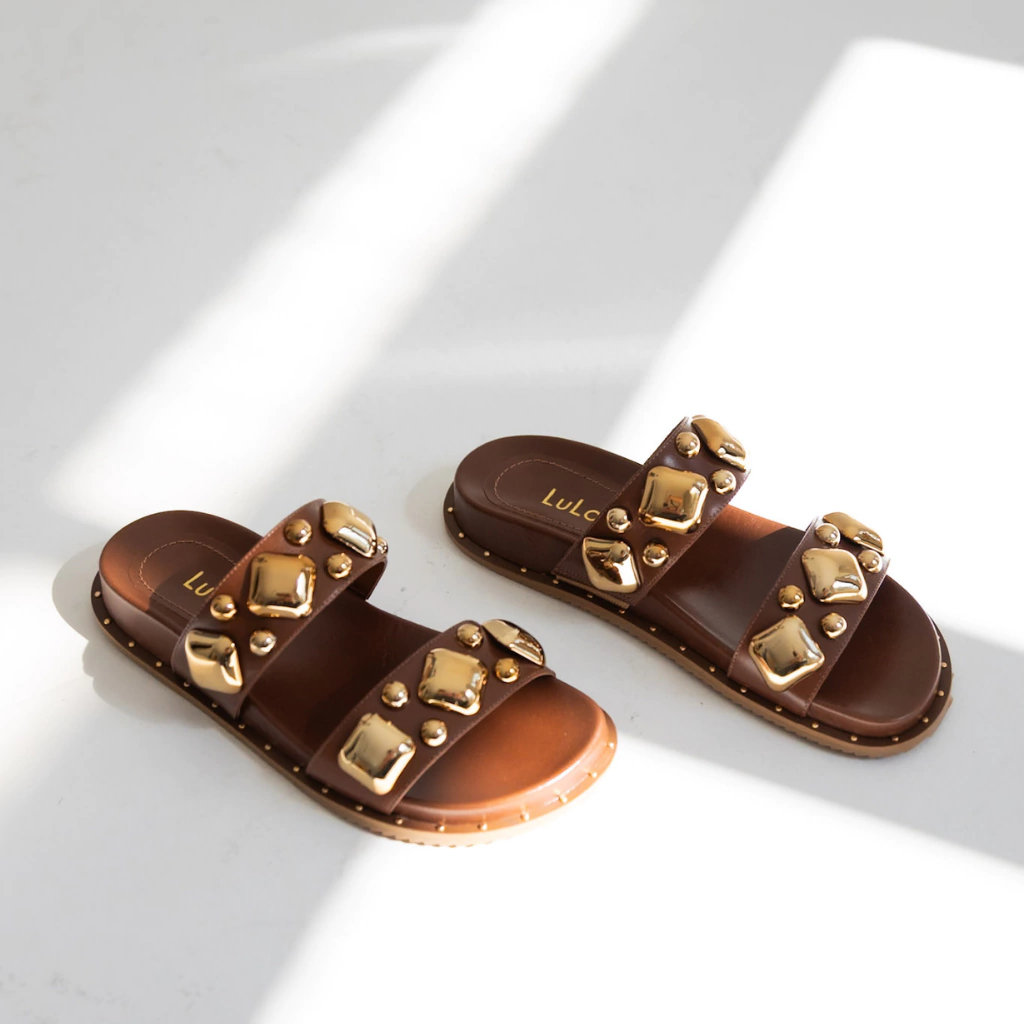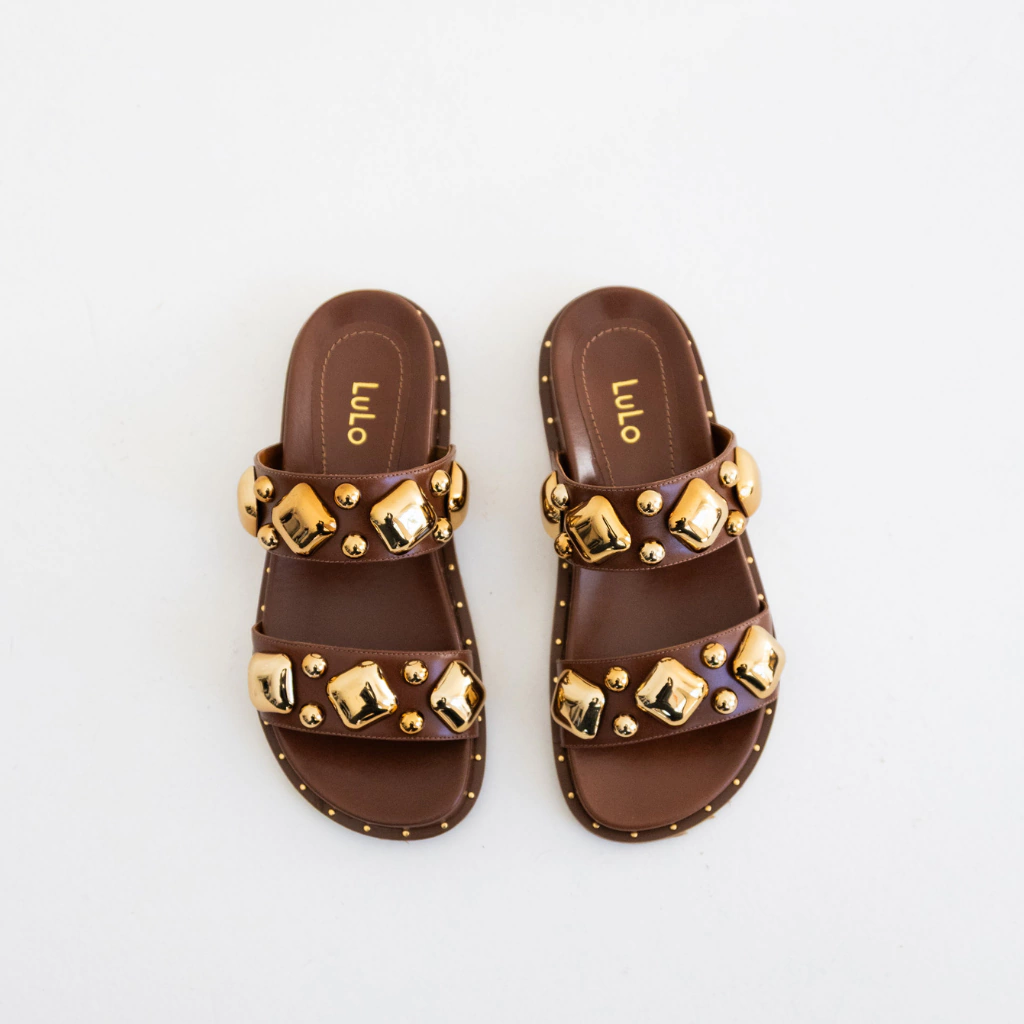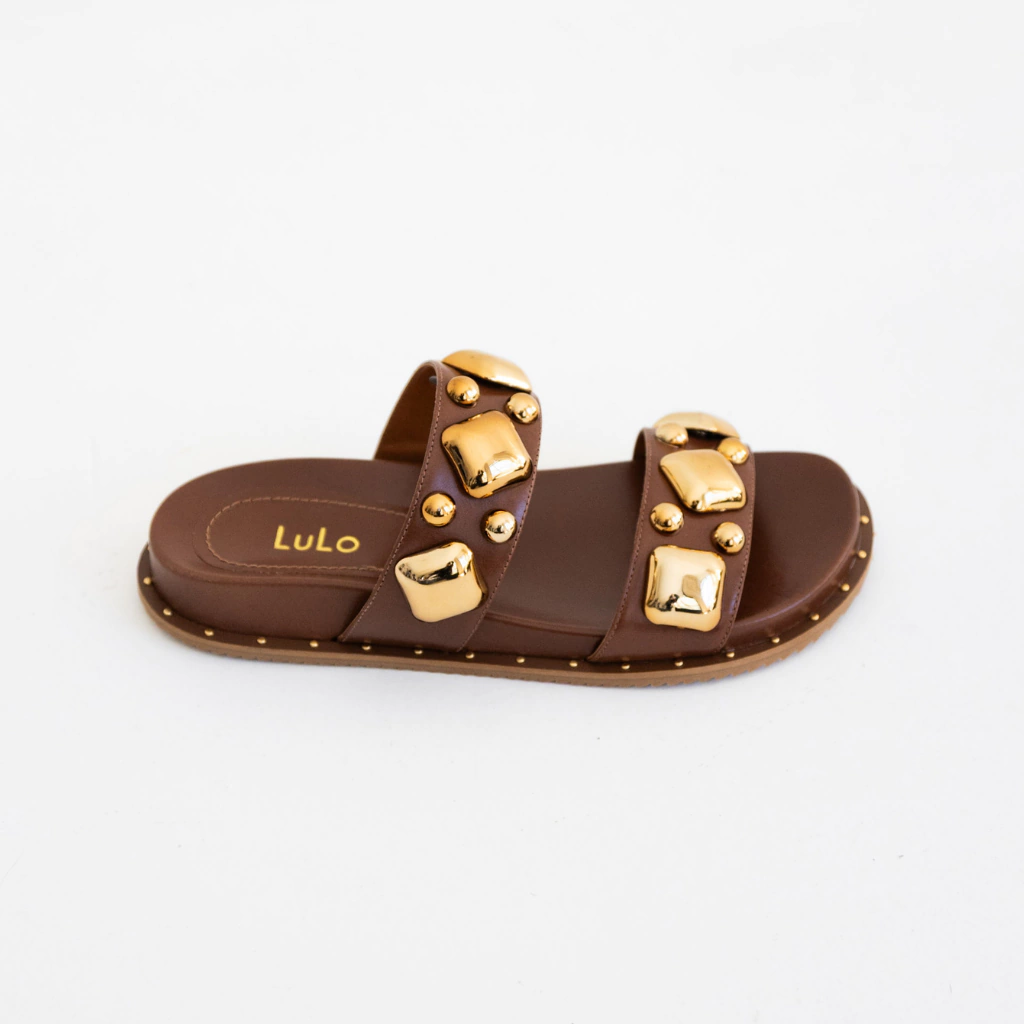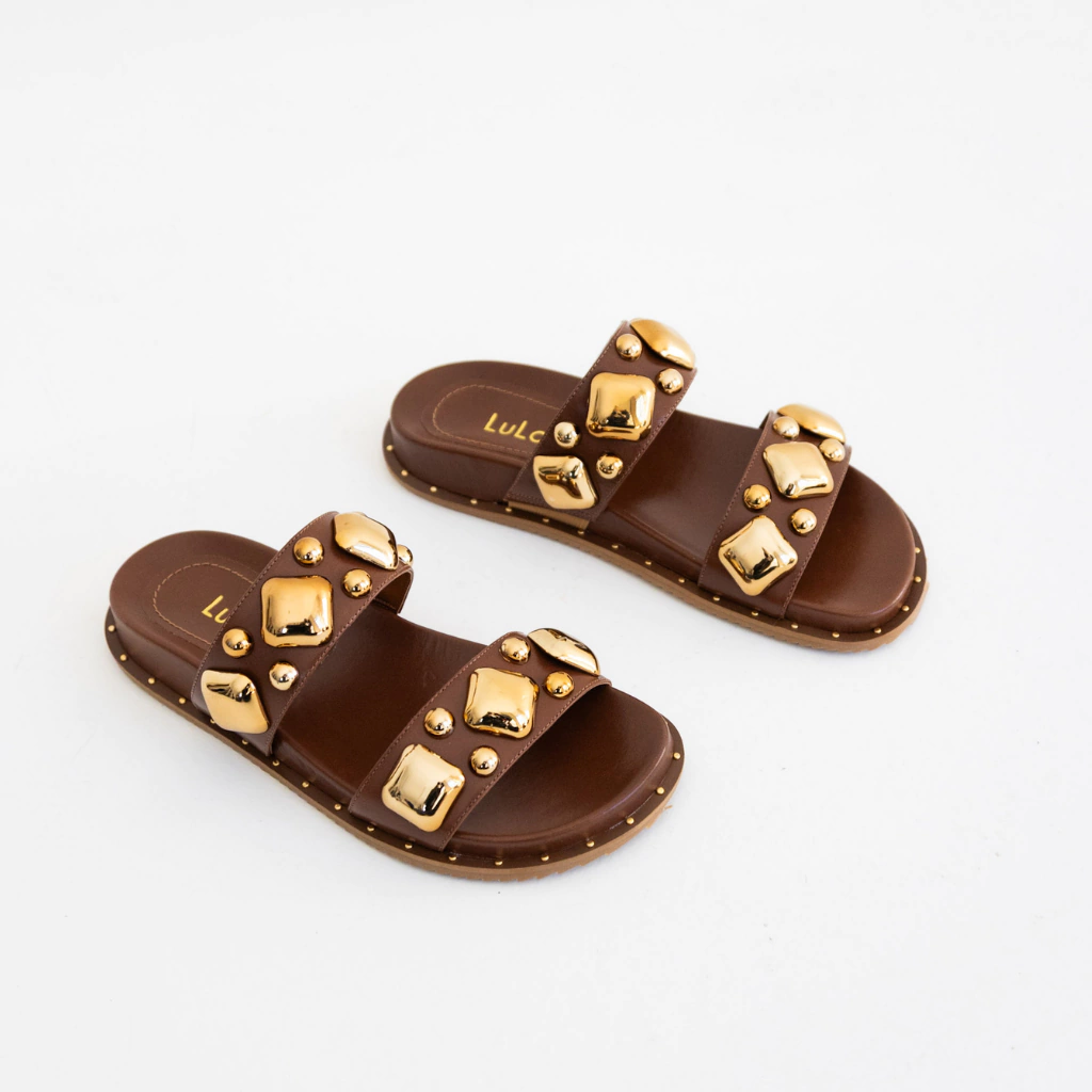 A Papete Lia combina atitude e conforto em um design contemporâneo que se destaca pelo contraste sofisticado do preto com os detalhes dourados. Confeccionada em couro legítimo, possui duas tiras largas adornadas por aplicações metálicas douradas em diferentes formas e tamanhos, que criam um visual impactante e moderno.