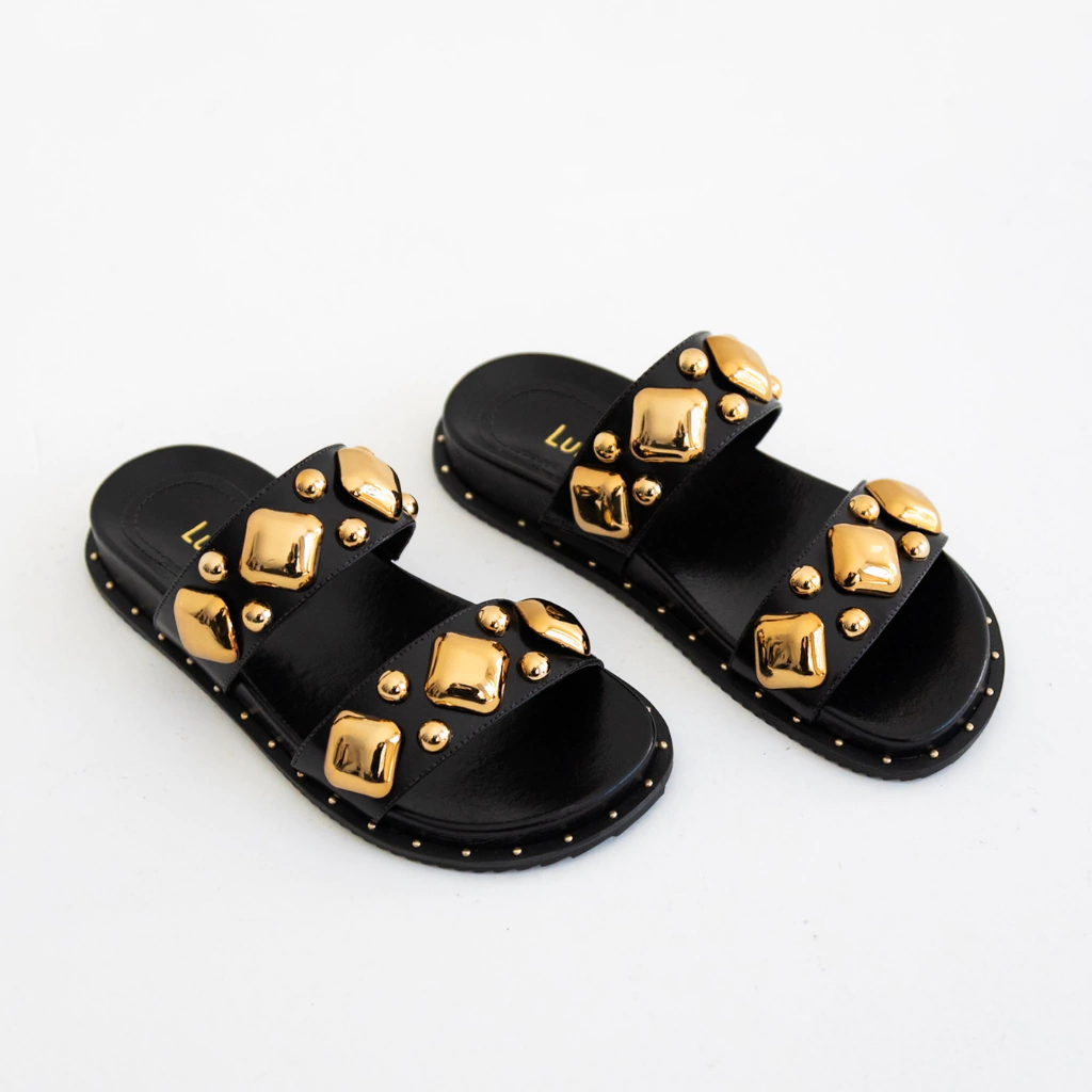 A Papete Lia combina atitude e conforto em um design contemporâneo que se destaca pelo contraste sofisticado do preto com os detalhes dourados. Confeccionada em couro legítimo, possui duas tiras largas adornadas por aplicações metálicas douradas em diferentes formas e tamanhos, que criam um visual impactante e moderno.