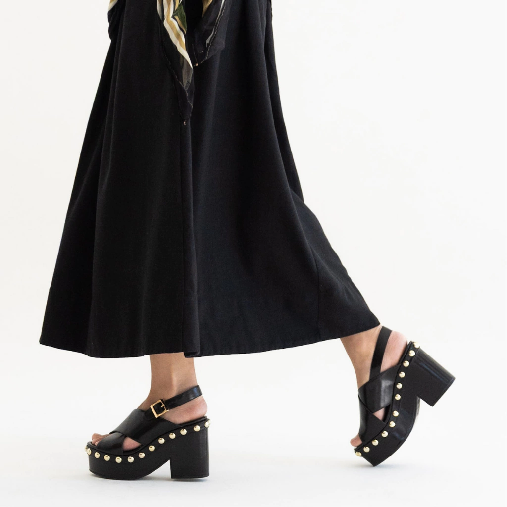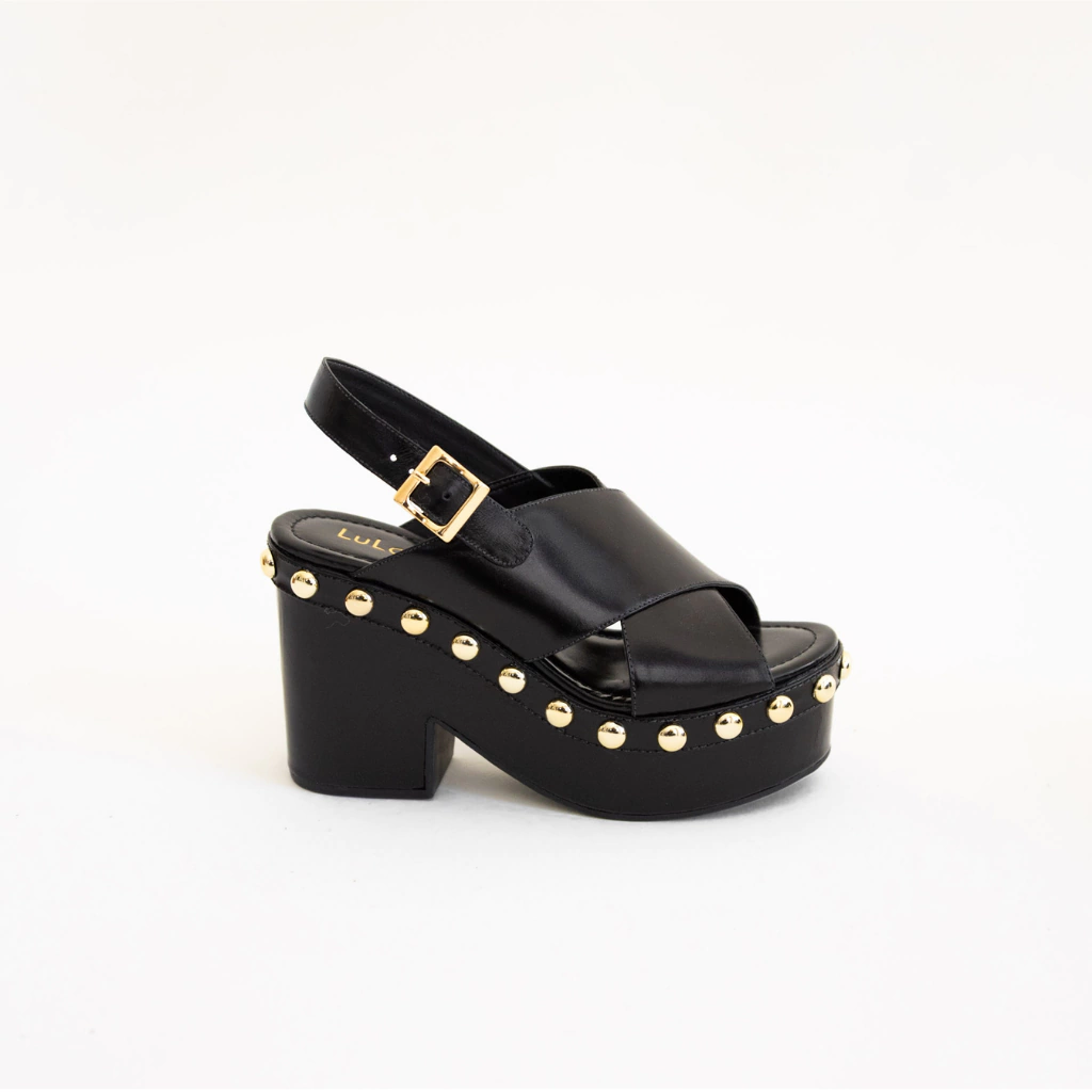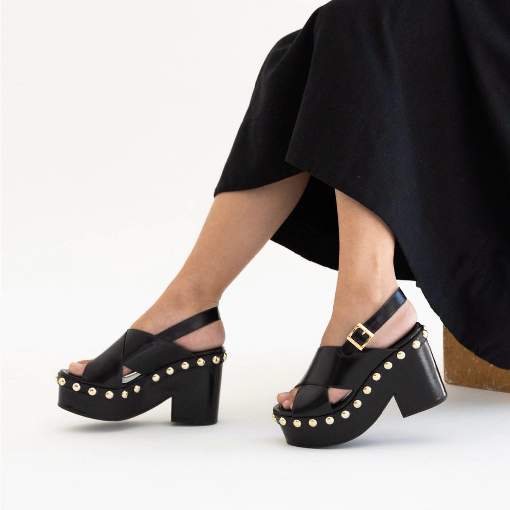 A Plataforma Aria é a definição de presença e sofisticação. Confeccionada em couro legítimo, traz cabedal com tiras cruzadas que garantem firmeza e conforto, enquanto as aplicações de studs dourados ao redor da sola adicionam um toque glam moderno e cheio de personalidade.