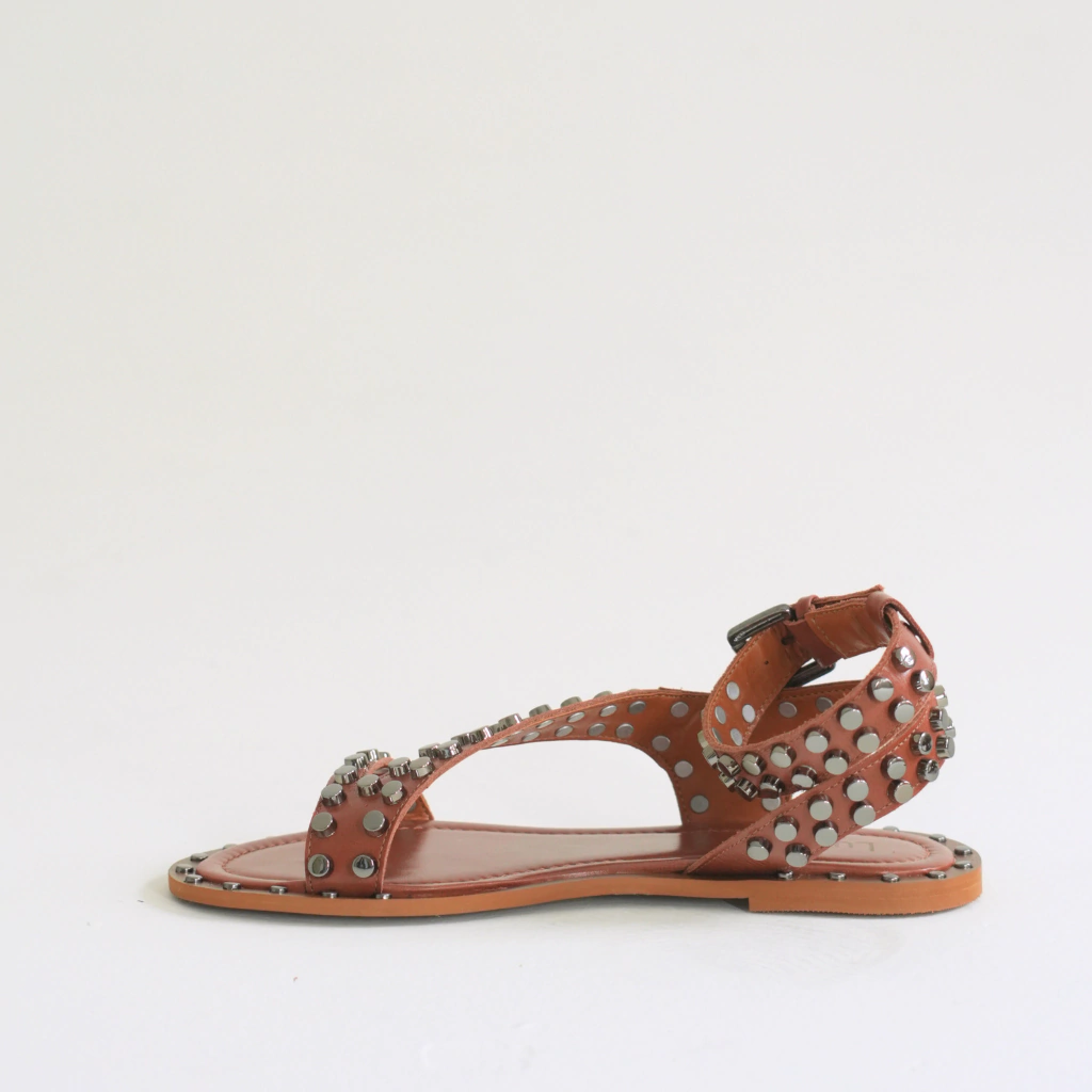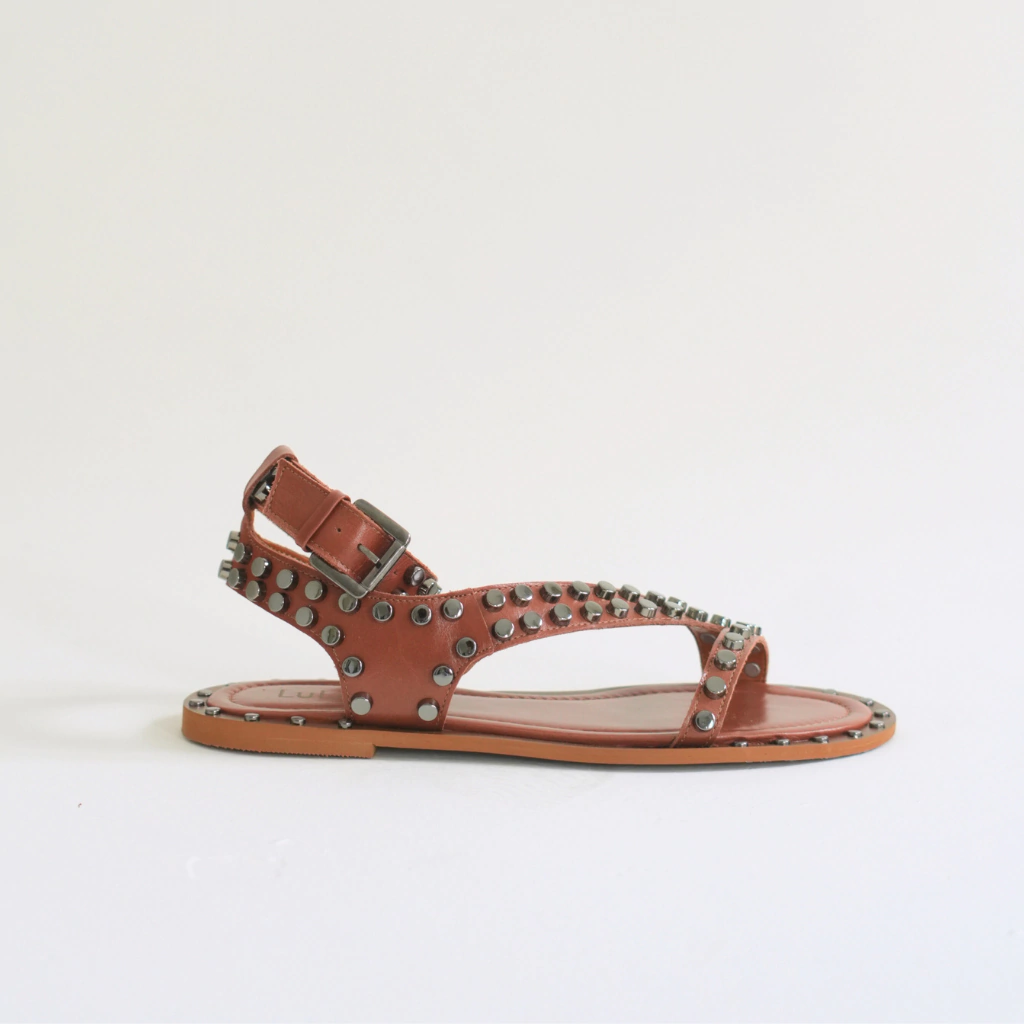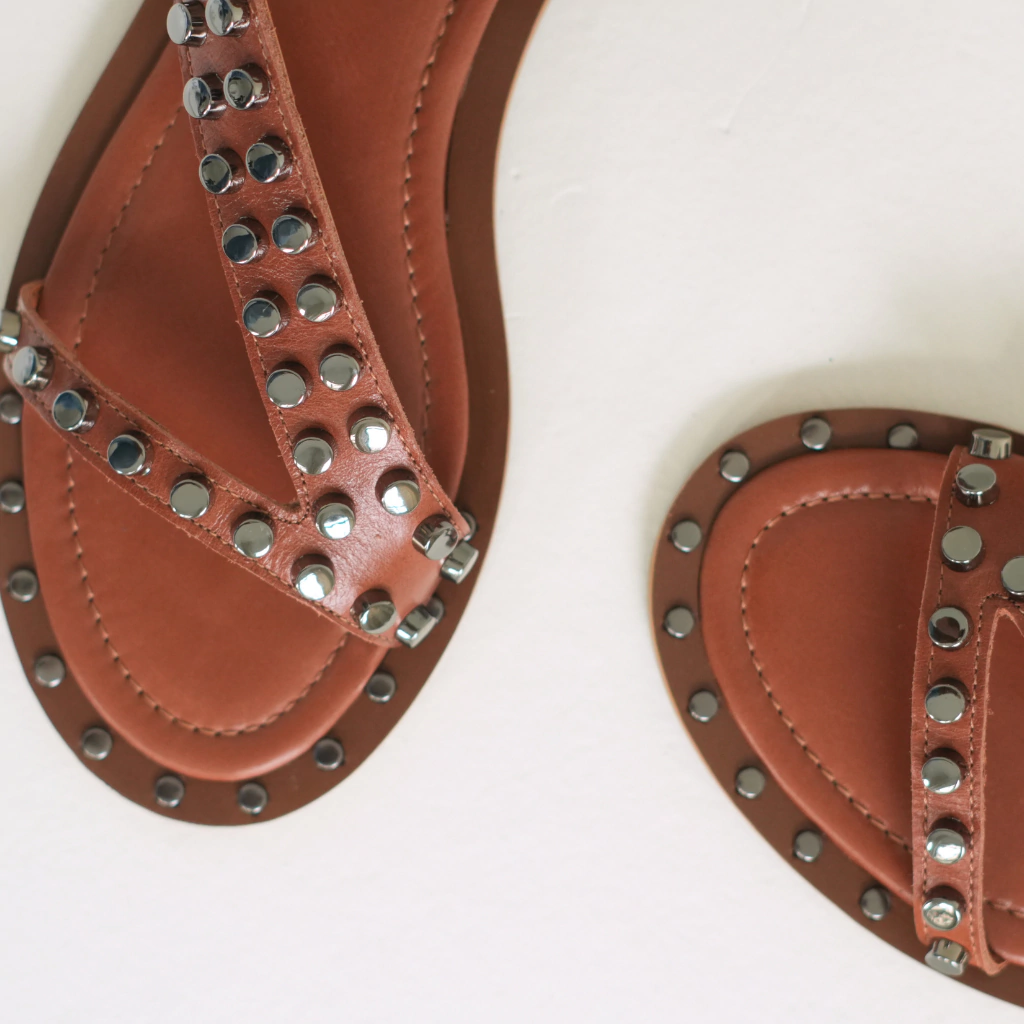 A Rasteira Cora é sinônimo de personalidade e estilo. Confeccionada em couro legítimo na cor pinhão, seu visual marcante se destaca pelas tachas metálicas grafite cuidadosamente aplicadas ao longo das tiras, criando um contraste moderno e cheio de atitude.
