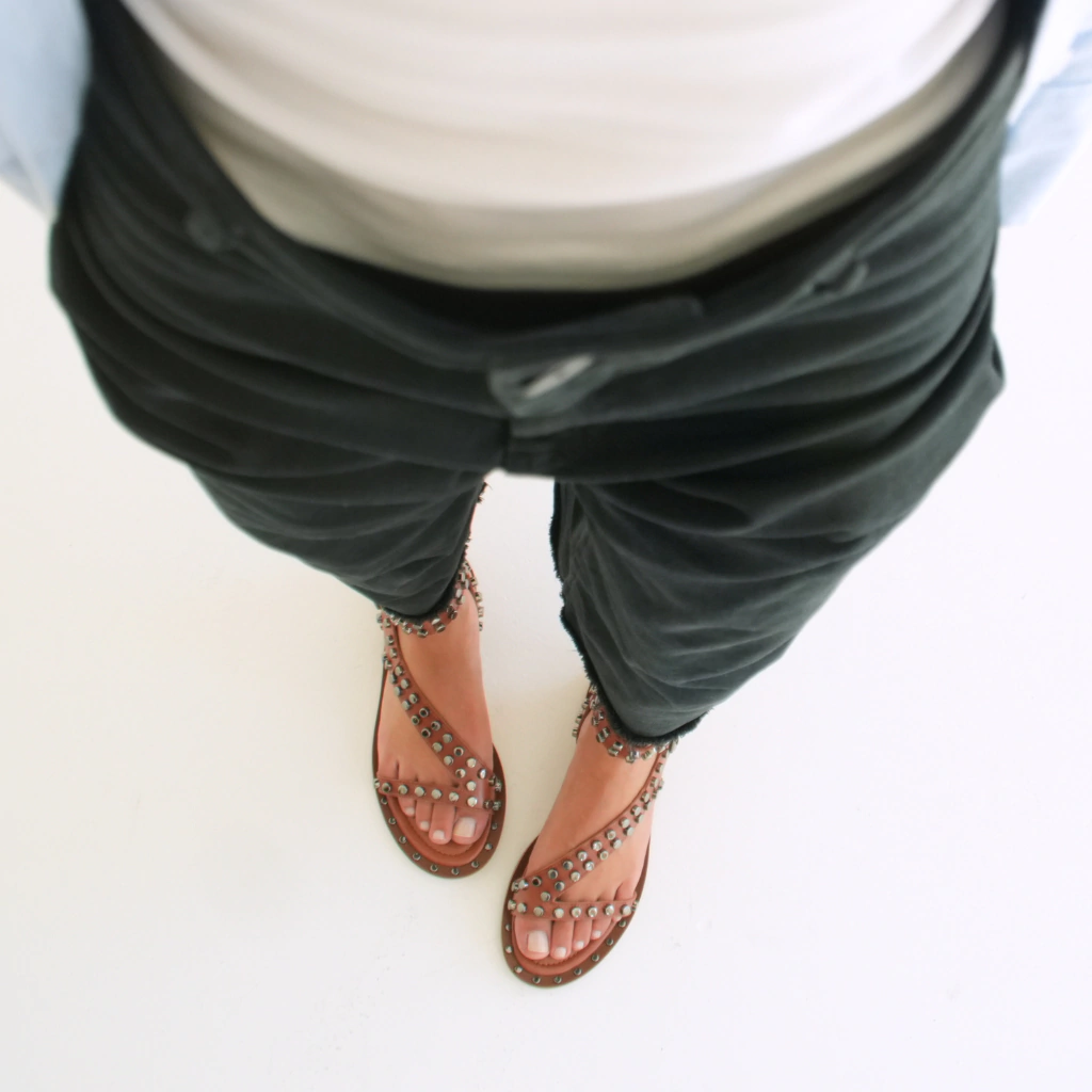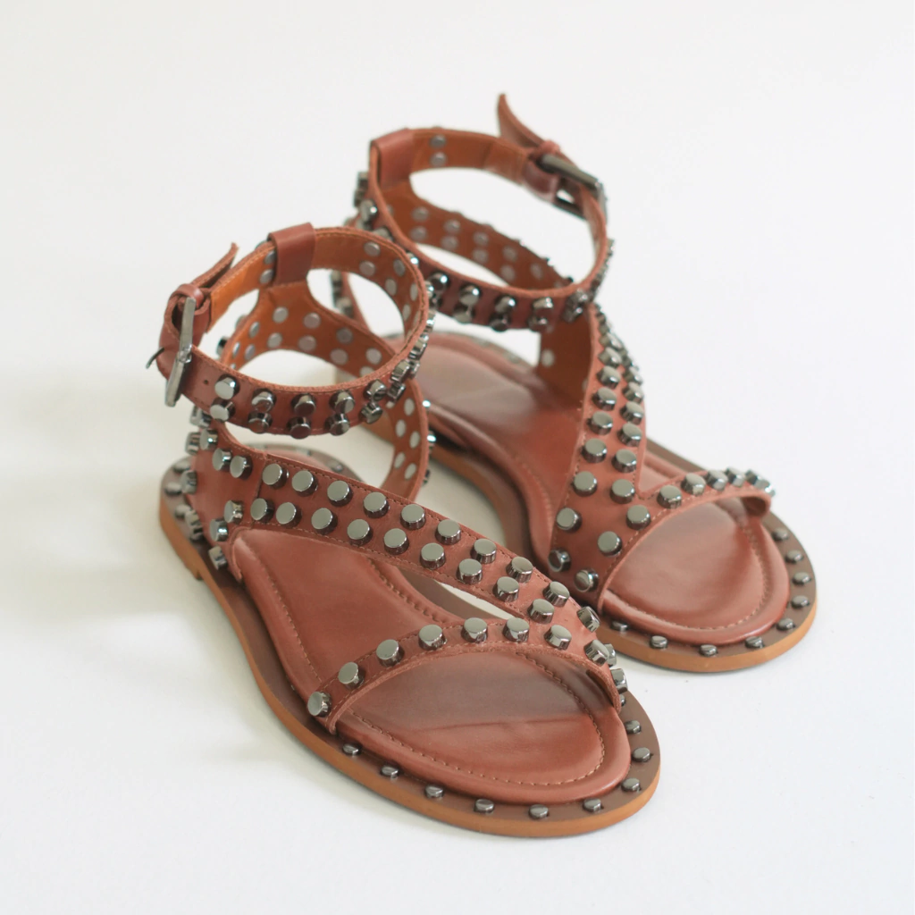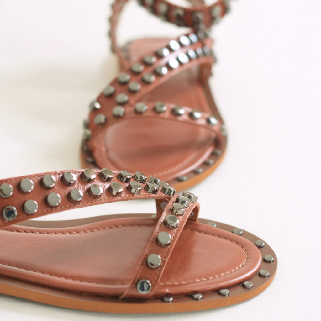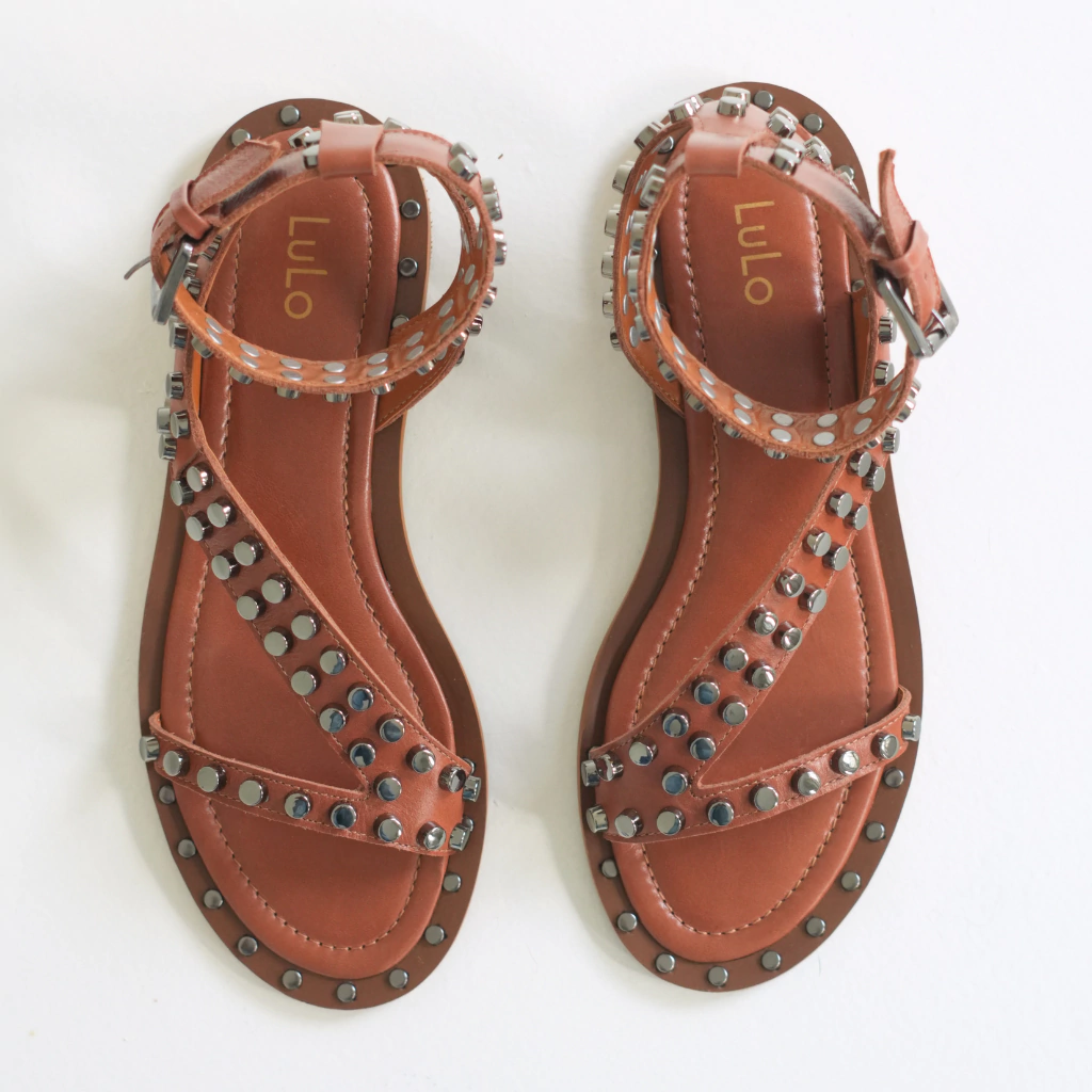 A Rasteira Cora é sinônimo de personalidade e estilo. Confeccionada em couro legítimo na cor pinhão, seu visual marcante se destaca pelas tachas metálicas grafite cuidadosamente aplicadas ao longo das tiras, criando um contraste moderno e cheio de atitude.