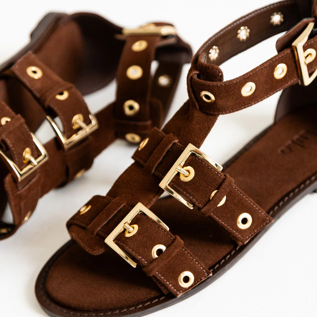 A Rasteira Lina traz a combinação perfeita de atitude e sofisticação em um design que não passa despercebido. Confeccionada em couro legítimo com acabamento em camurça na elegante cor Cacau, o modelo se destaca pelas fivelas douradas e ilhoses metálicos, que adicionam um toque moderno e cheio de estilo.