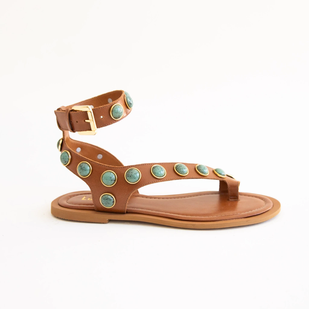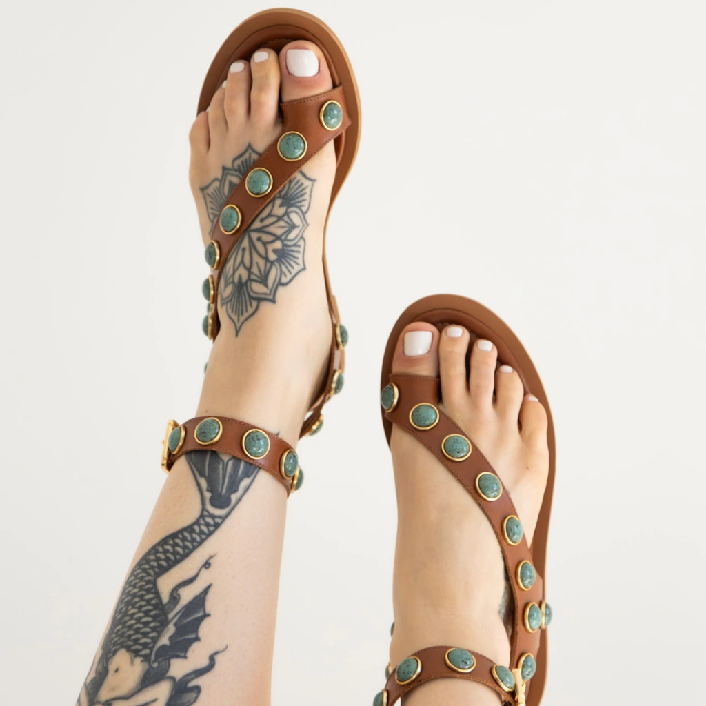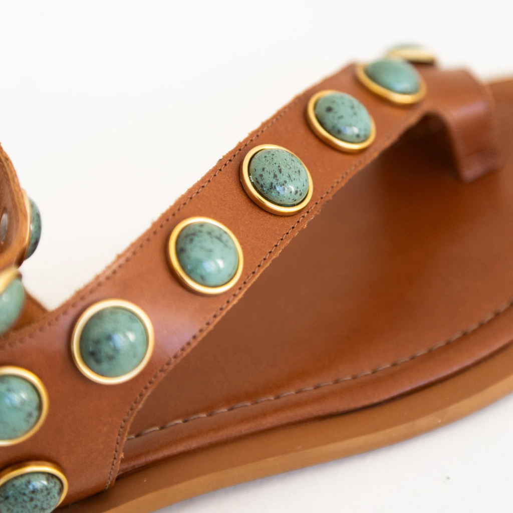 A Rasteira Lira combina delicadeza e sofisticação em um design que encanta nos mínimos detalhes. Confeccionada em couro legítimo, ela se destaca pelas aplicações douradas e pedras turquesa, que trazem um toque artesanal e elegante ao modelo.