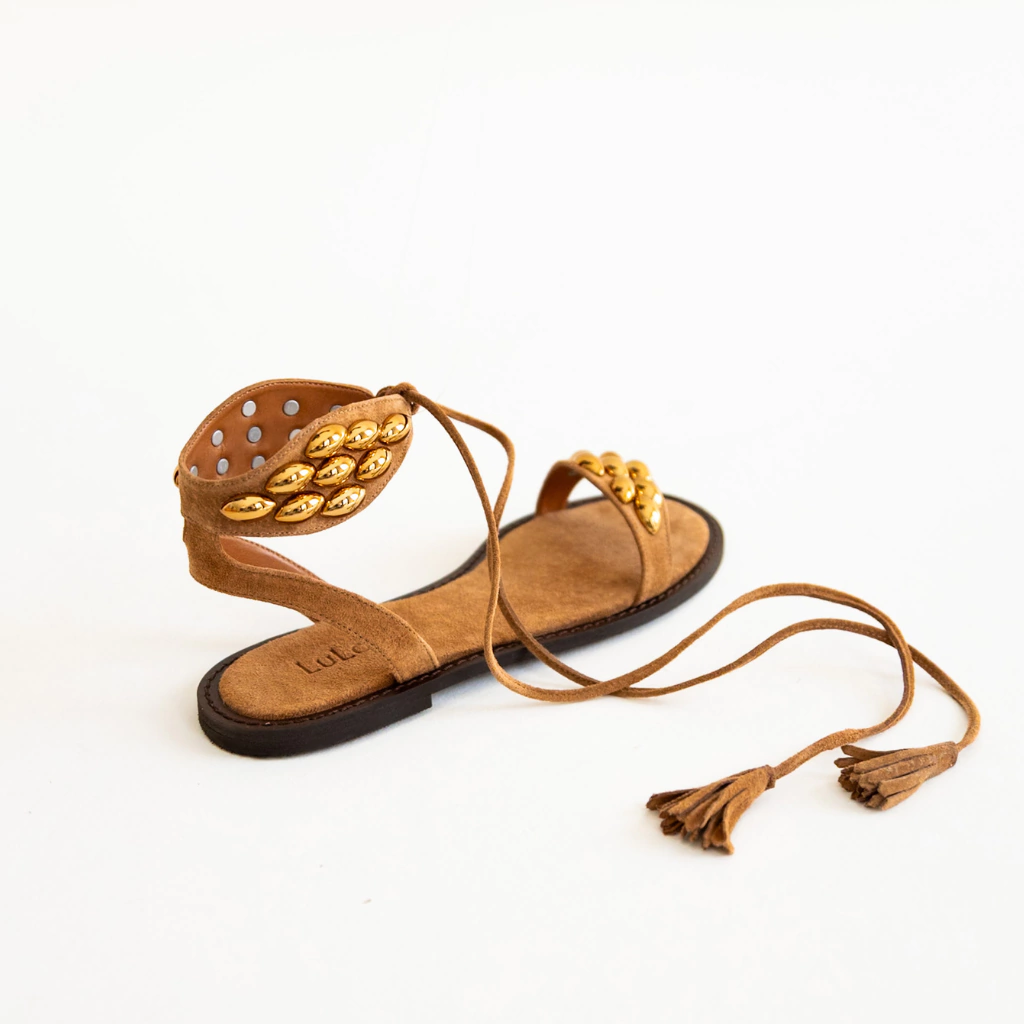 A Rasteira Lua é a definição de elegância e estilo com um toque boêmio chic. Confeccionada em couro legítimo com acabamento em camurça, ela traz um cabedal adornado com aplicações de studs dourados que iluminam o calçado, enquanto o fechamento com amarração e tassels na perna garante um ajuste perfeito e um charme extra.