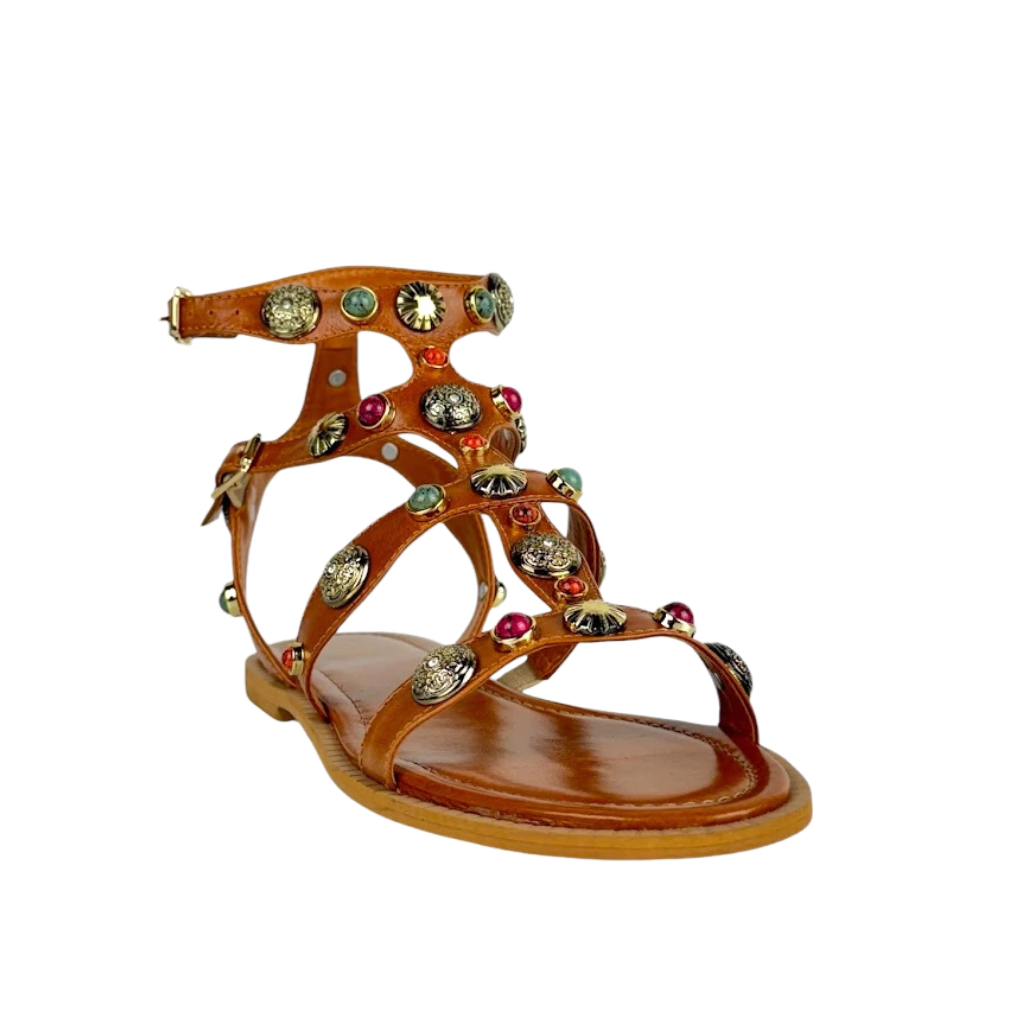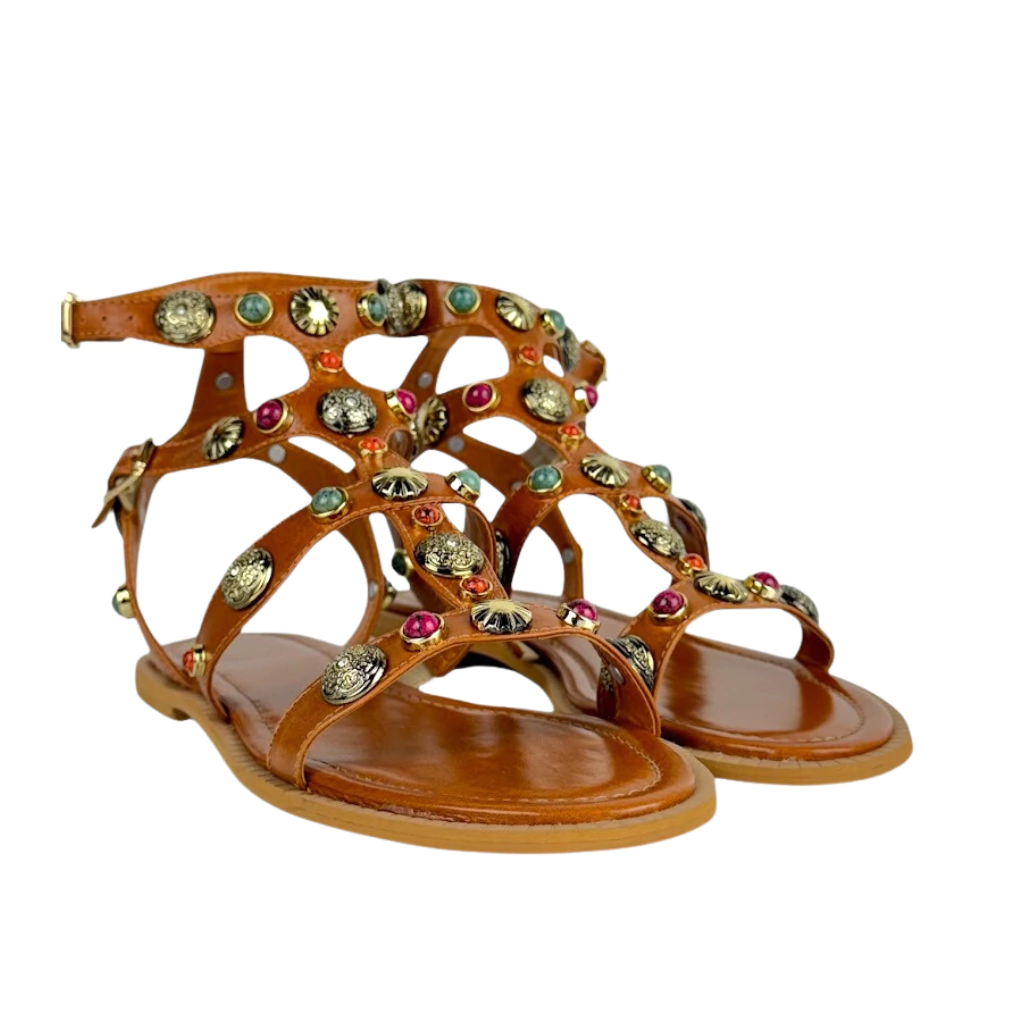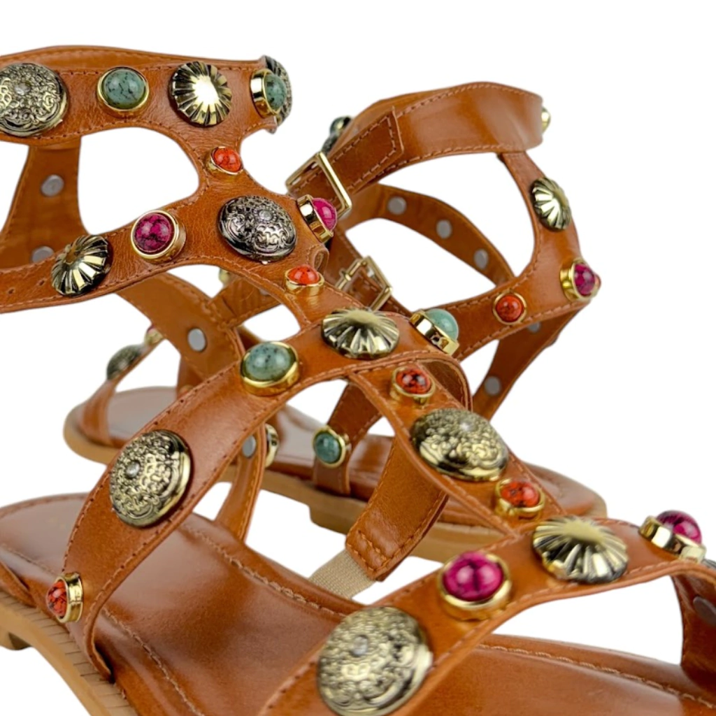 Apresentamos a Rasteira Rio, um ícone de estilo e conforto para seu dia a dia. Confeccionada em couro legítimo na cor caramelo, esta sandália oferece durabilidade e um toque de sofisticação. O design é enriquecido por detalhes únicos, incluindo pedras coloridas e medalhas meticulosamente aplicadas, que capturam a essência da beleza artesanal.