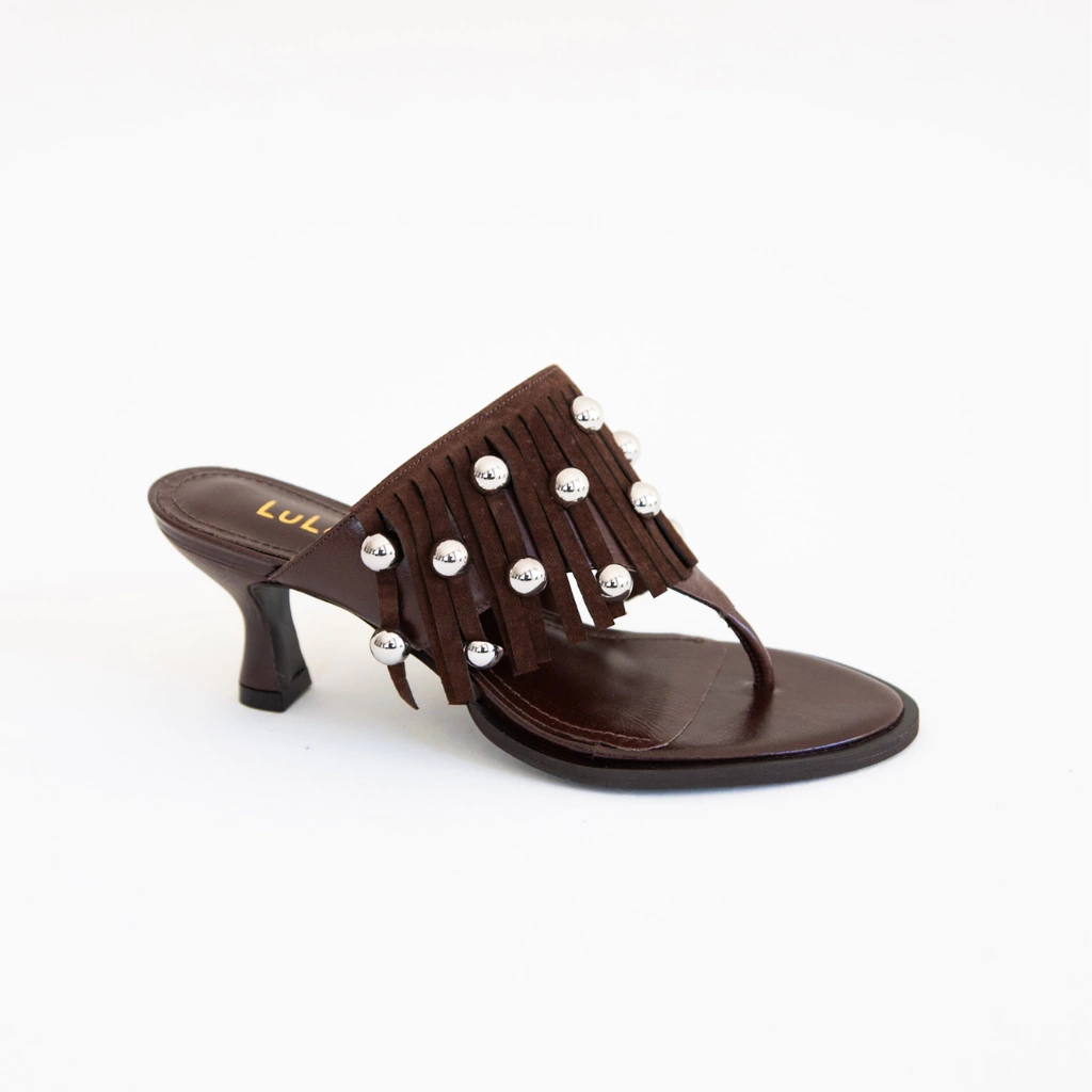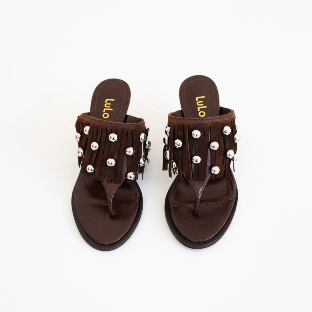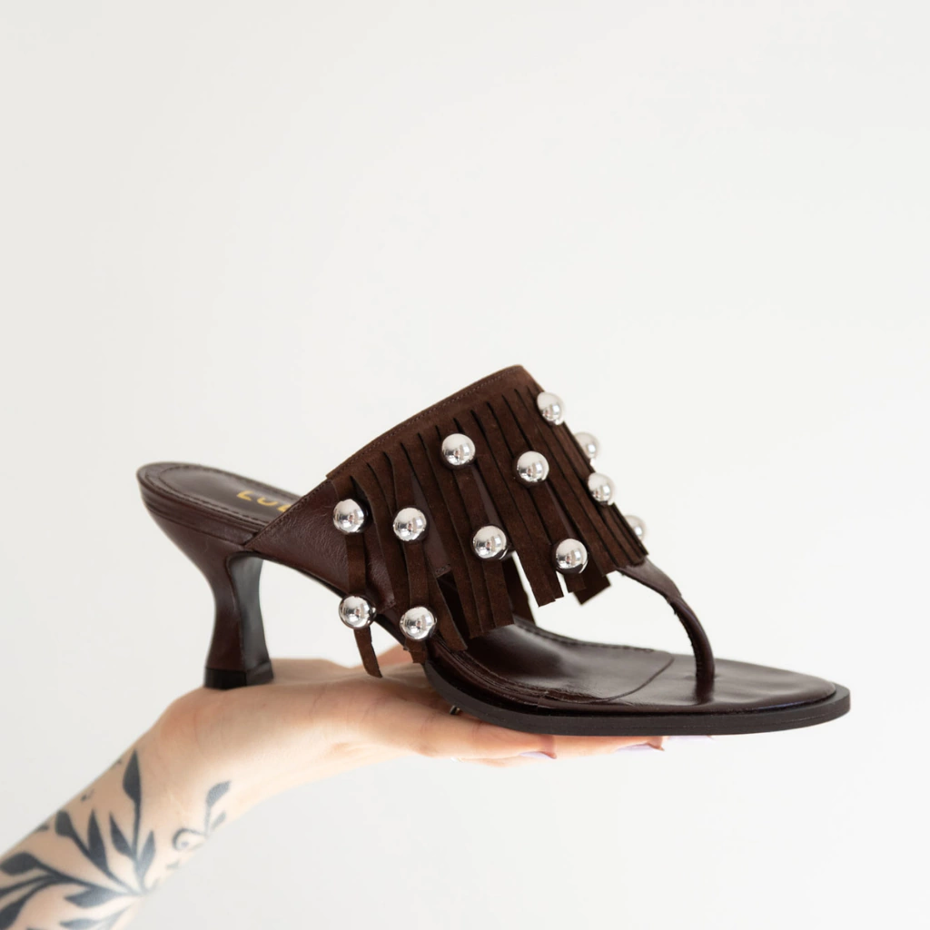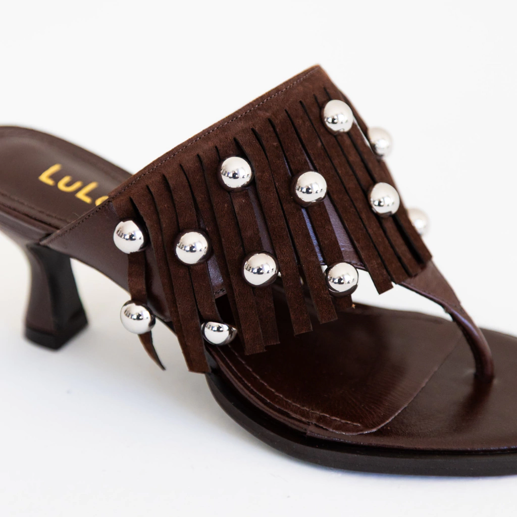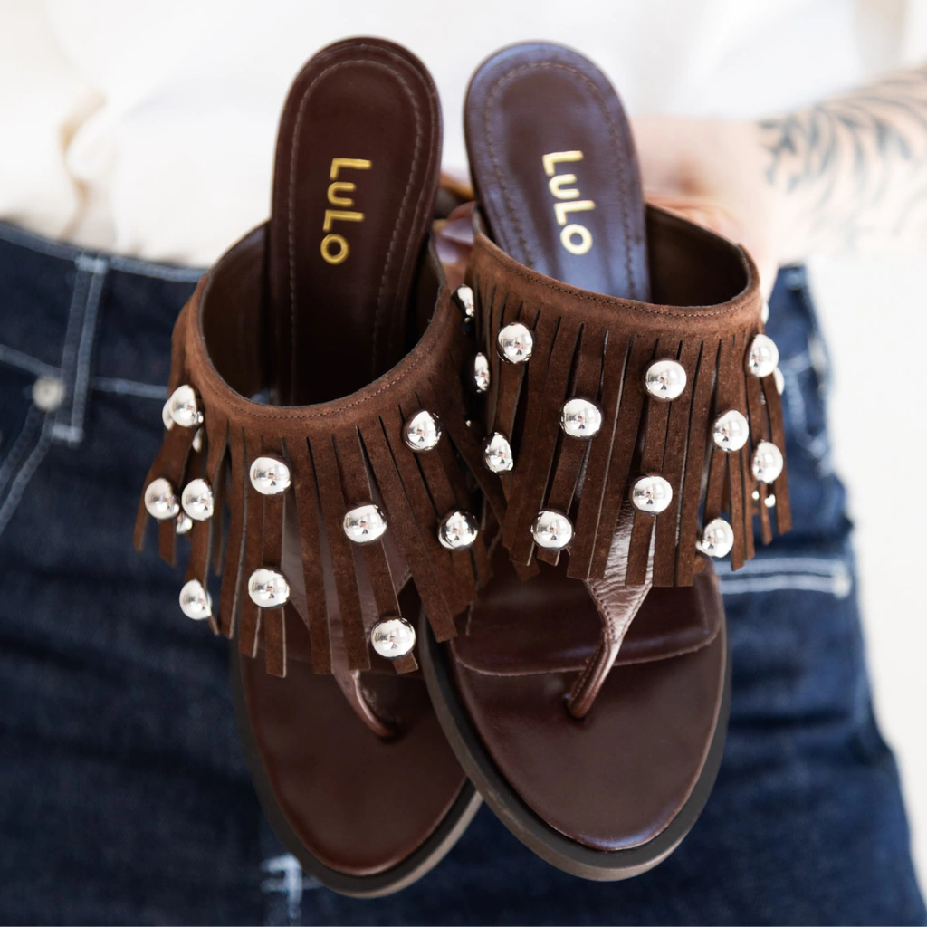Detalhes: Franjas em camurça com tachas metálicas prateadas