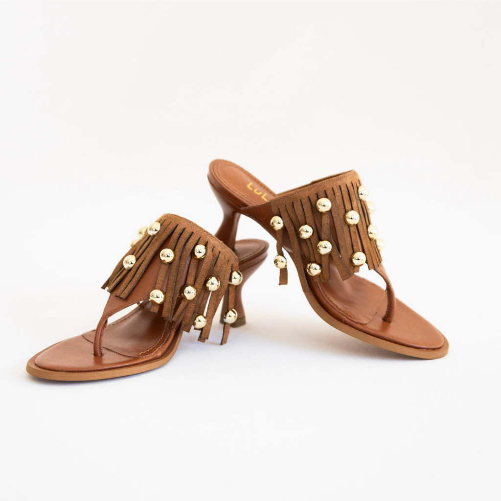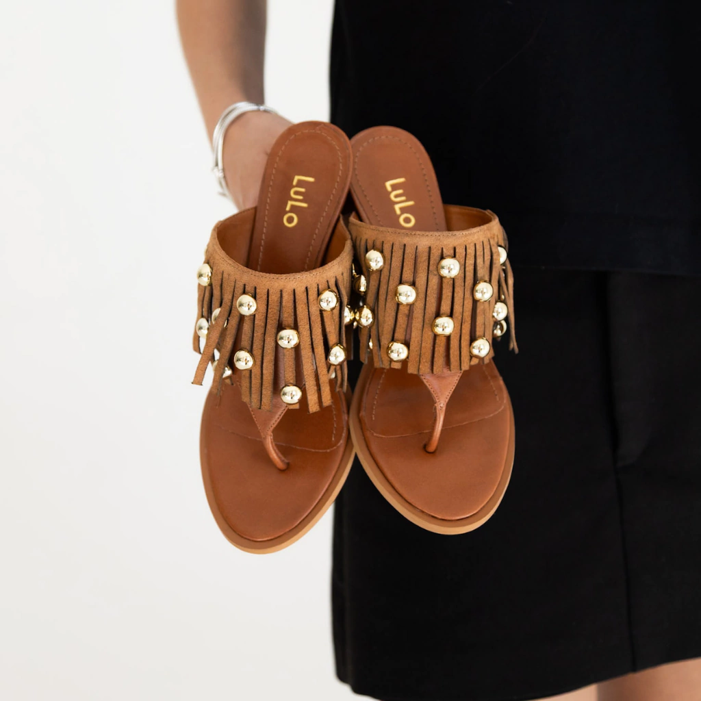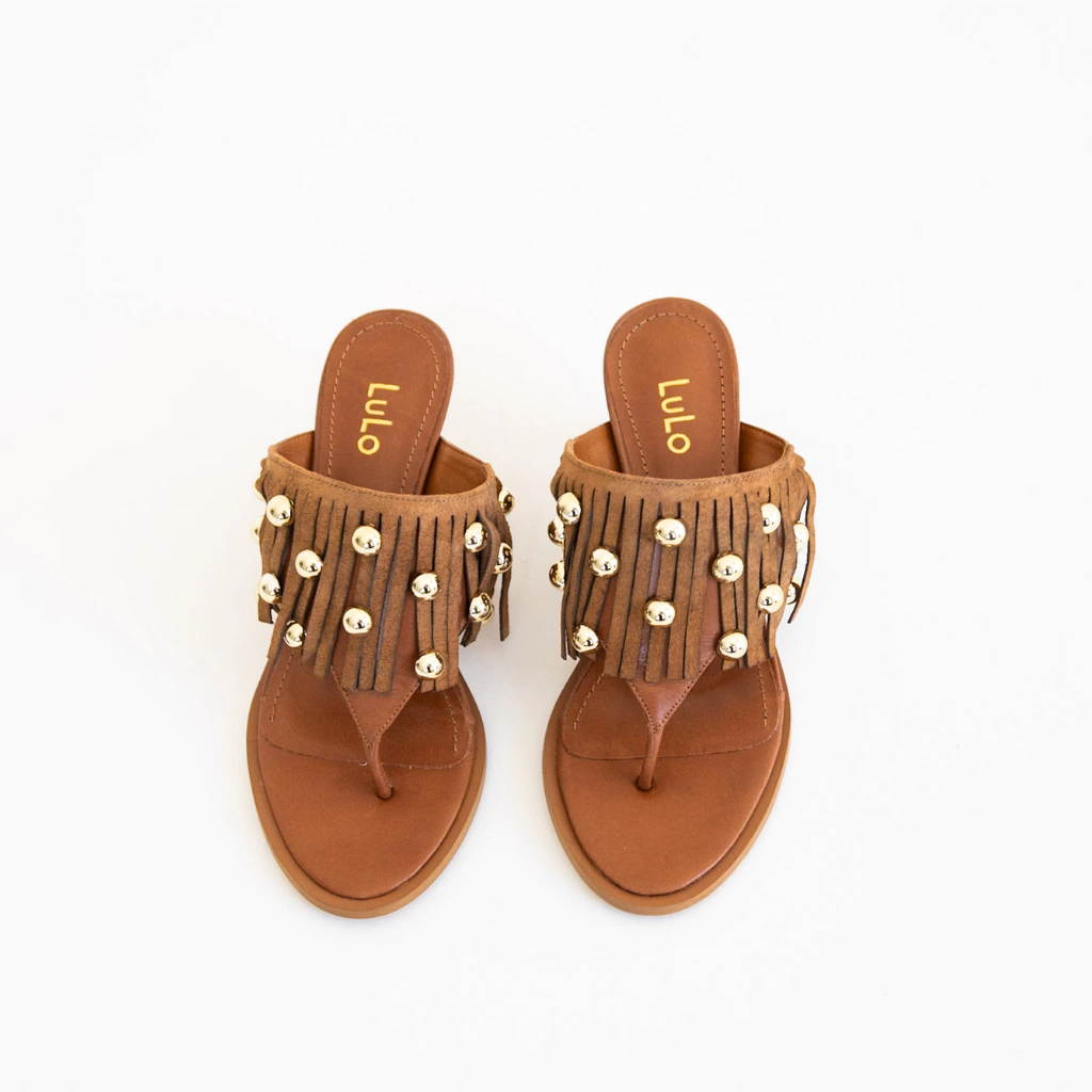 Detalhes: Franjas em camurça com tachas metálicas douradas