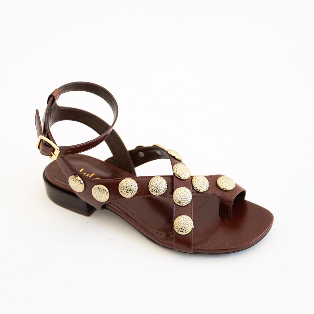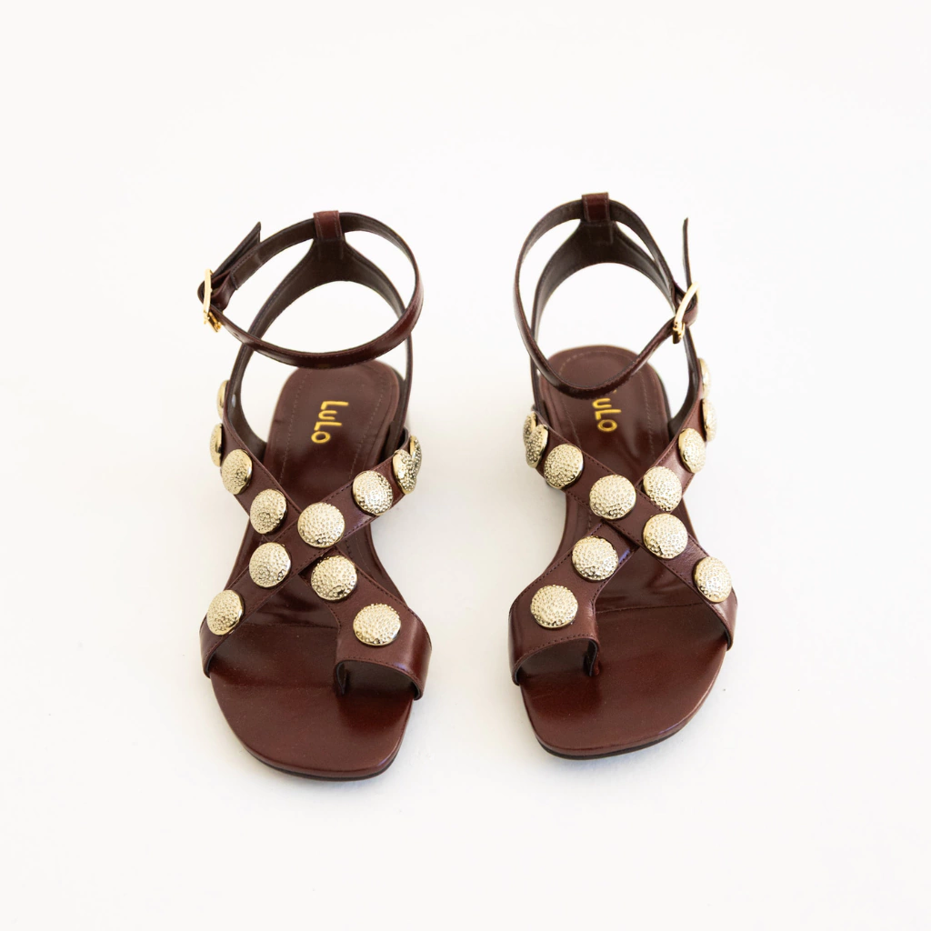 A Sandália Doha combina elegância e ousadia em um design que chama atenção nos mínimos detalhes. Confeccionada em couro legítimo, seu cabedal cruzado é adornado com maxi studs dourados texturizados, que criam um contraste sofisticado com o preto profundo do couro, garantindo um visual moderno e imponente.