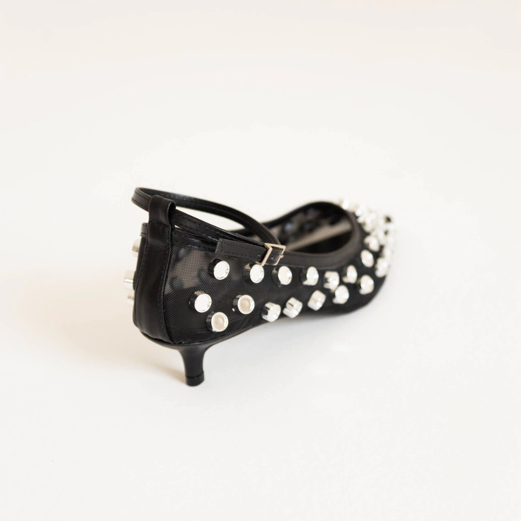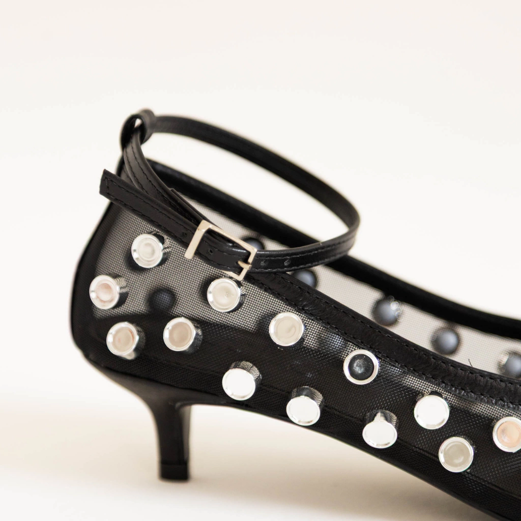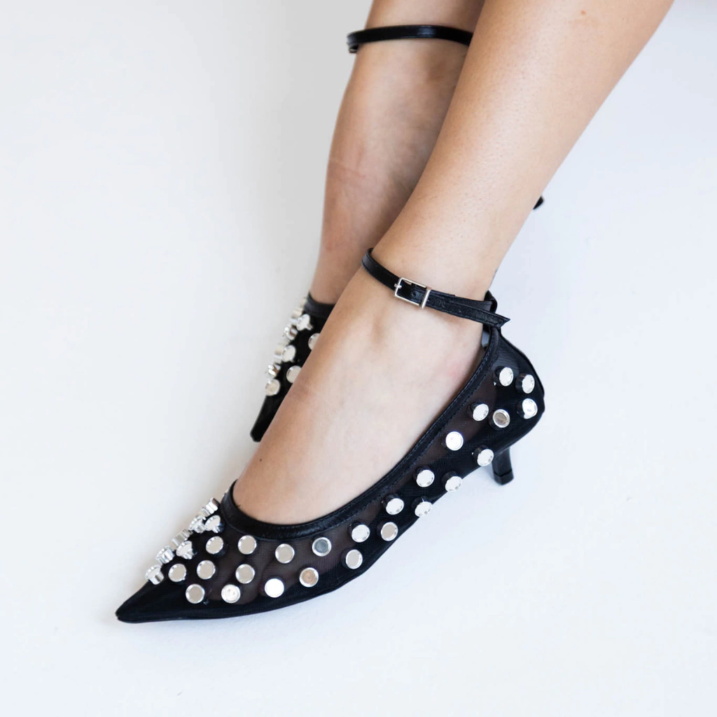 Seu cabedal em tela estruturada com acabamento em couro legítimo recebe a aplicação de tachas metálicas na cor prata, que adicionam brilho sutil e atitude à composição.