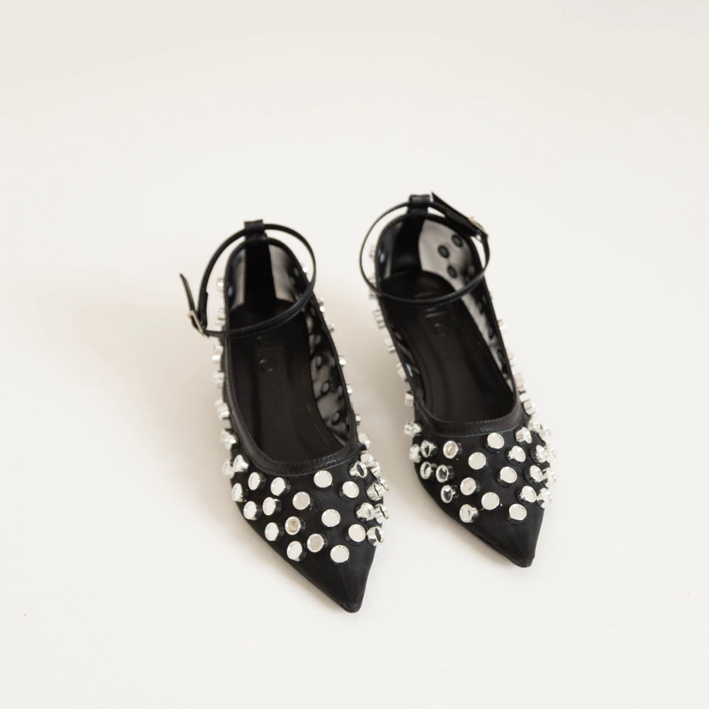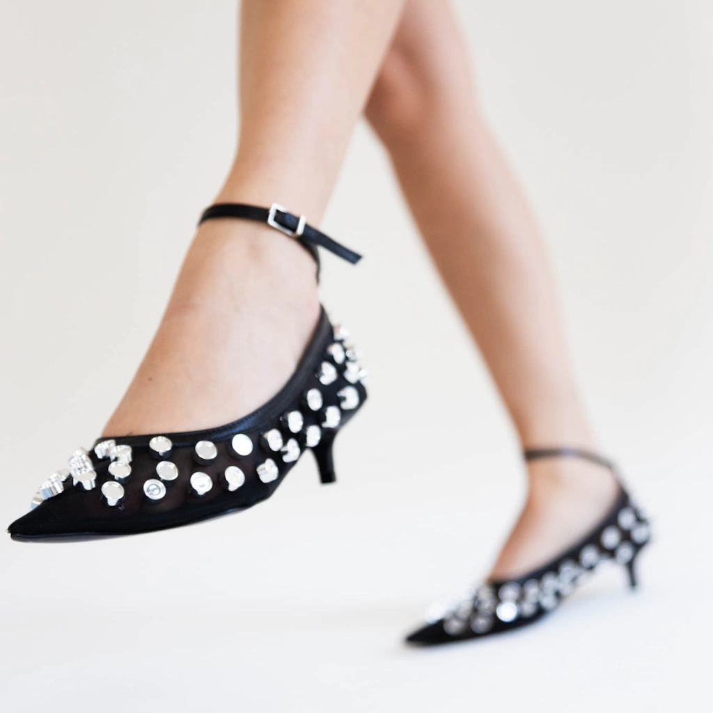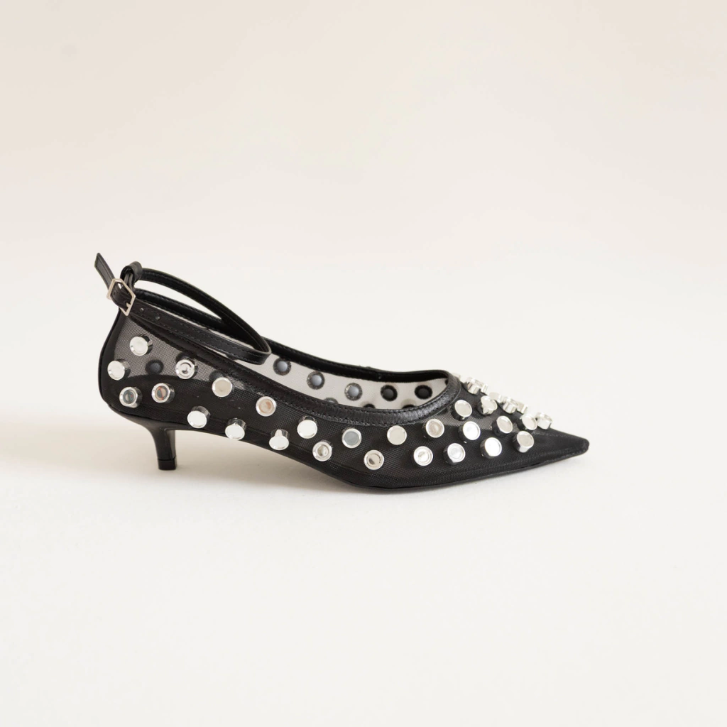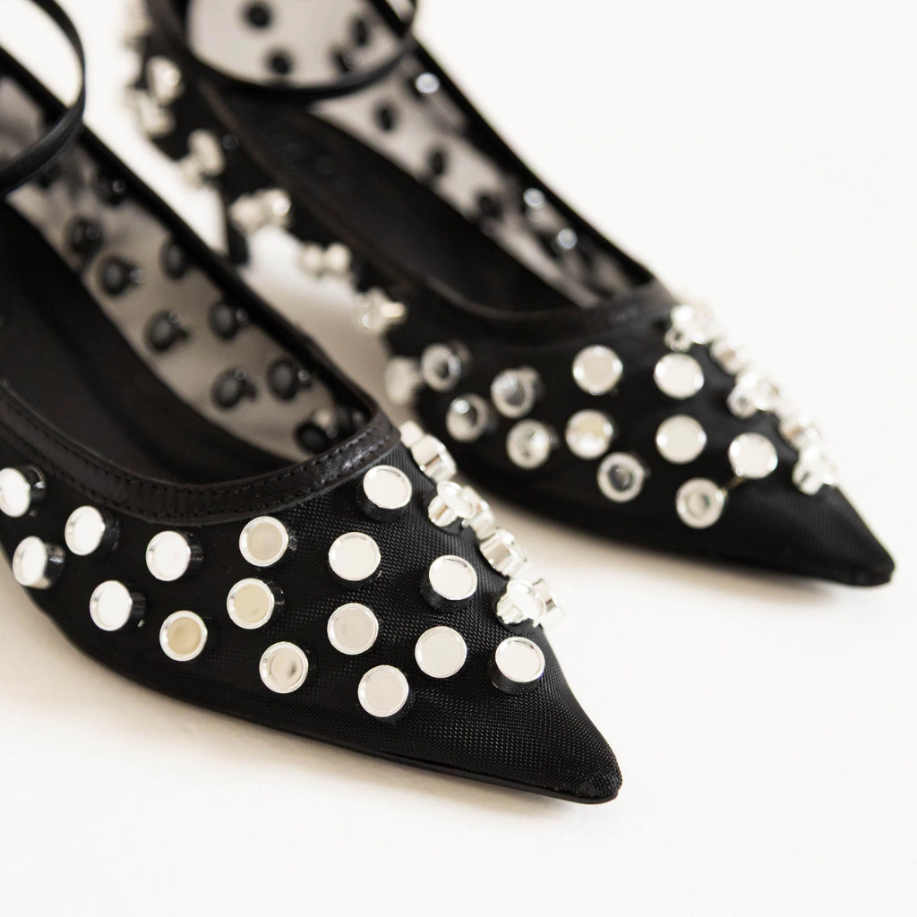 Seu cabedal em tela estruturada com acabamento em couro legítimo recebe a aplicação de tachas metálicas na cor prata, que adicionam brilho sutil e atitude à composição.