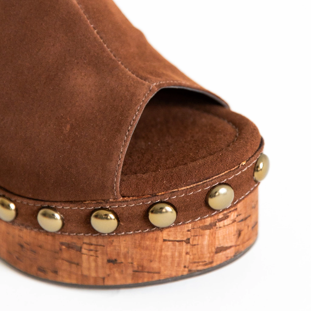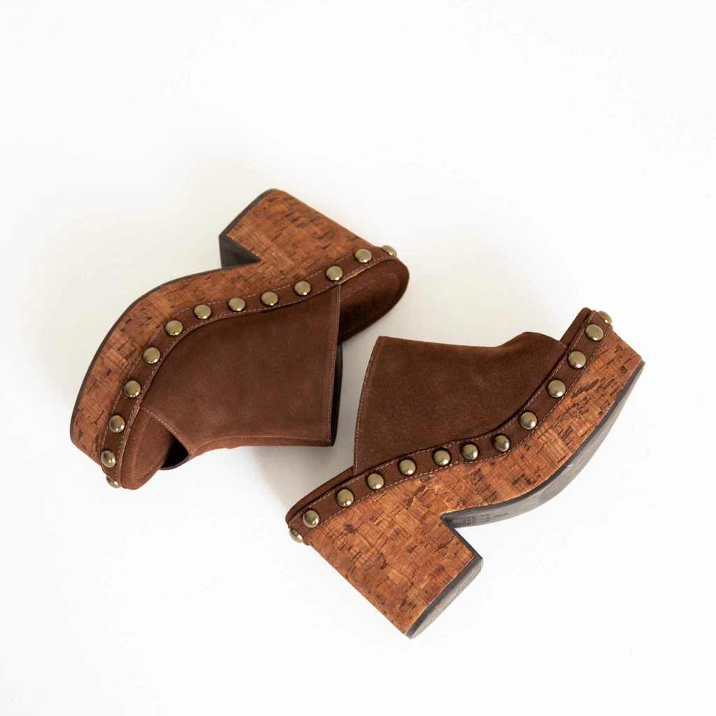 O Tamanco Nilo é a tradução perfeita de estilo e presença. Feito em camurça de couro legítimo na cor Cacau, ele combina a sofisticação da textura aveludada com a ousadia das aplicações de tachas em tom ouro velho, que trazem brilho e modernidade na medida certa.